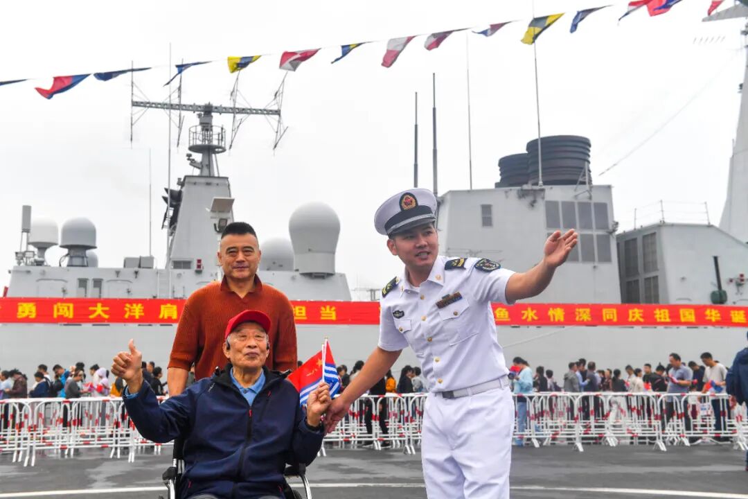 85岁退役军人刘先生乘坐轮椅,在家人的陪同下参观游览。当看到海军先进的武器装备,他不禁流下激动的泪水:“这些武器装备,比我们当兵的时候好太多了!我为祖国自豪、为祖国祝福!”