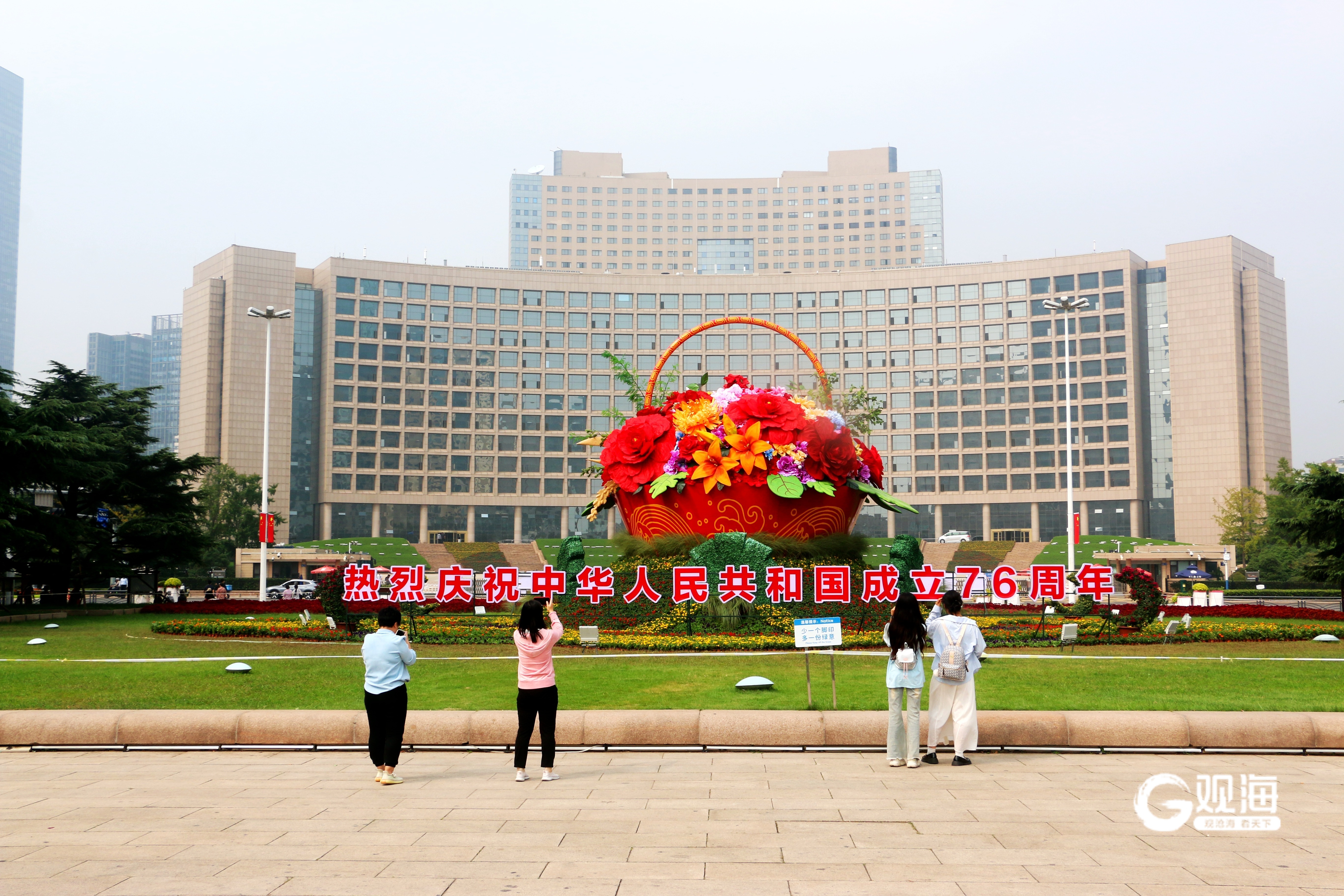 往来市民游客纷纷驻足拍照,记录美好时刻,镜头里定格的是笑容,更是对祖国的深情祝福。街头的“中国红”与主题景观花坛交相辉映,营造出喜庆、热烈、祥和的节日氛围。(青岛日报/观海新闻记者 梁超 文/图)