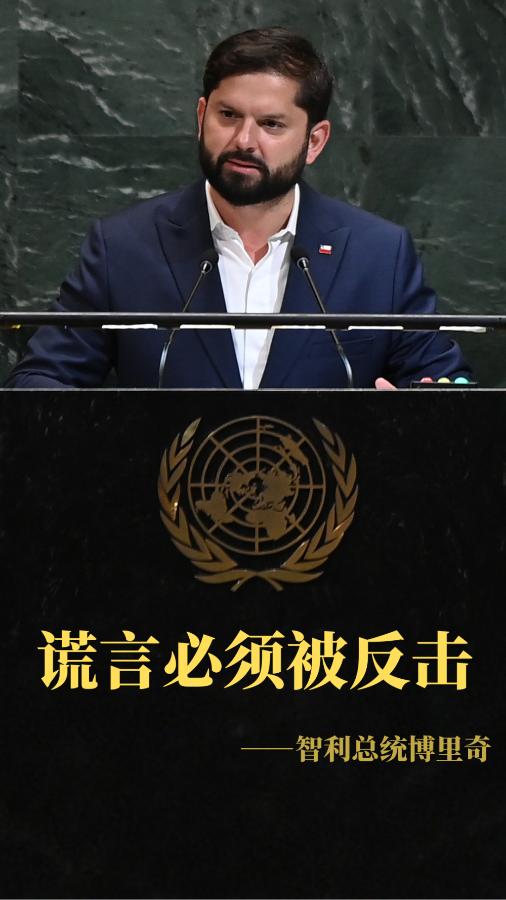 智利总统博里奇说:“今天就在这个讲台上,有人声称全球变暖根本不存在。这不是‘观点’,而是谎言。谎言必须被反击。”