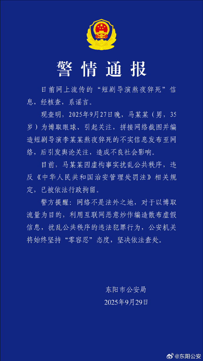 浙江东阳警方通报“短剧导演熬夜猝死”:造谣者已行拘