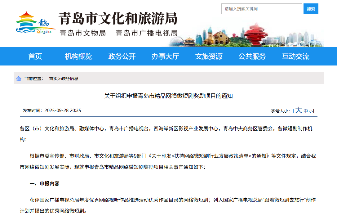 青岛日报社/观海新闻9月30日讯 根据市委宣传部、市财政局、市文化和旅游局等9部门《关于印发<扶持网络微短剧行业发展政策清单>的通知》等文件规定,结合青岛市网络微短剧发展实际,近日,市文化和旅游局发布《关于组织申报青岛市精品网络微短剧奖励项目的通知》,启动青岛市精品网络微短剧奖励项目申报工作。