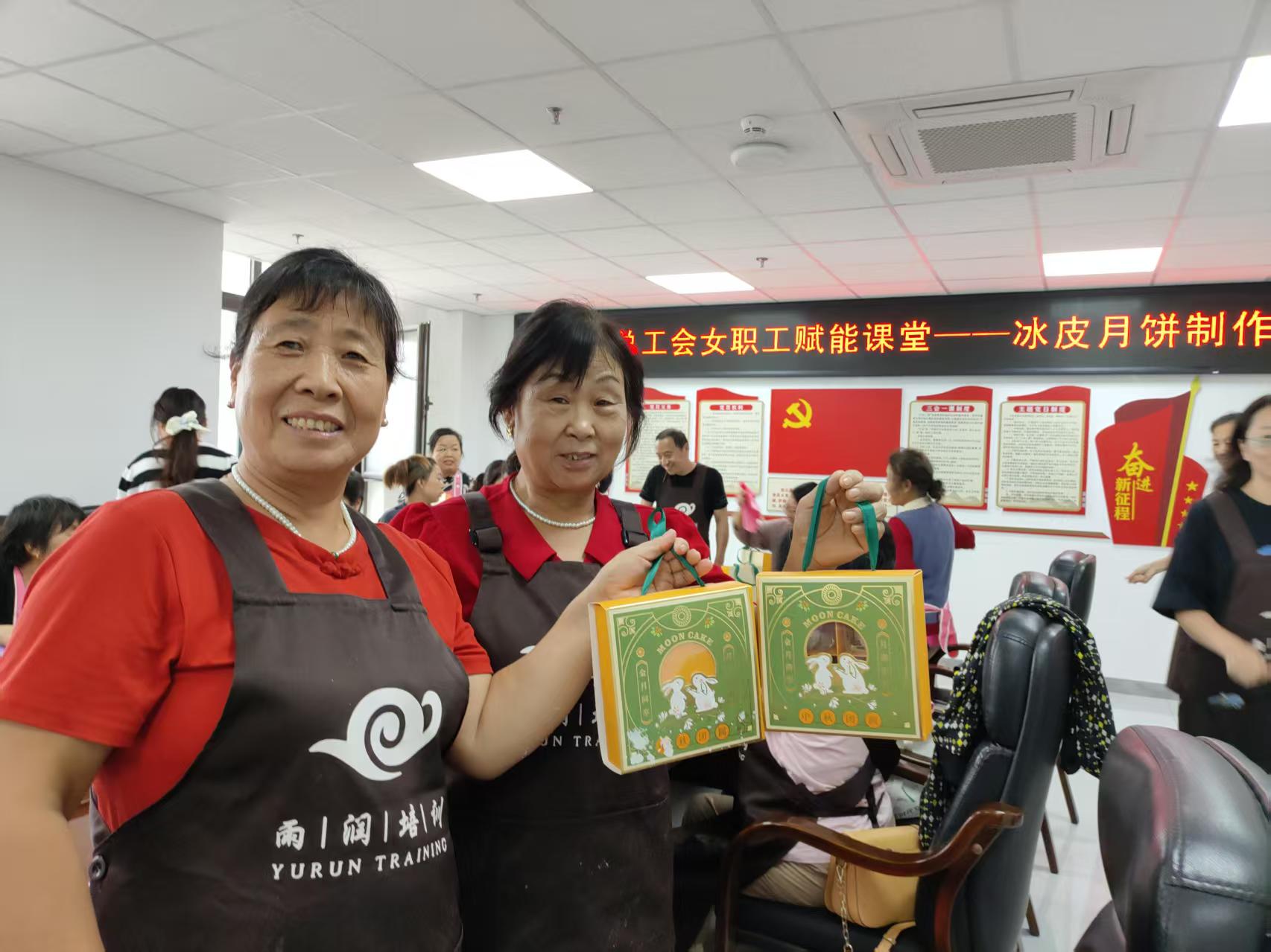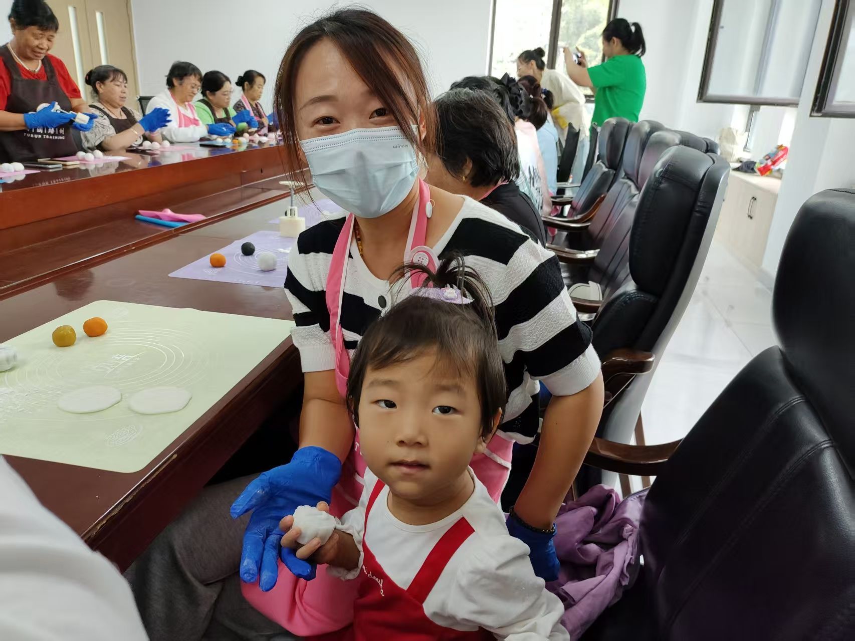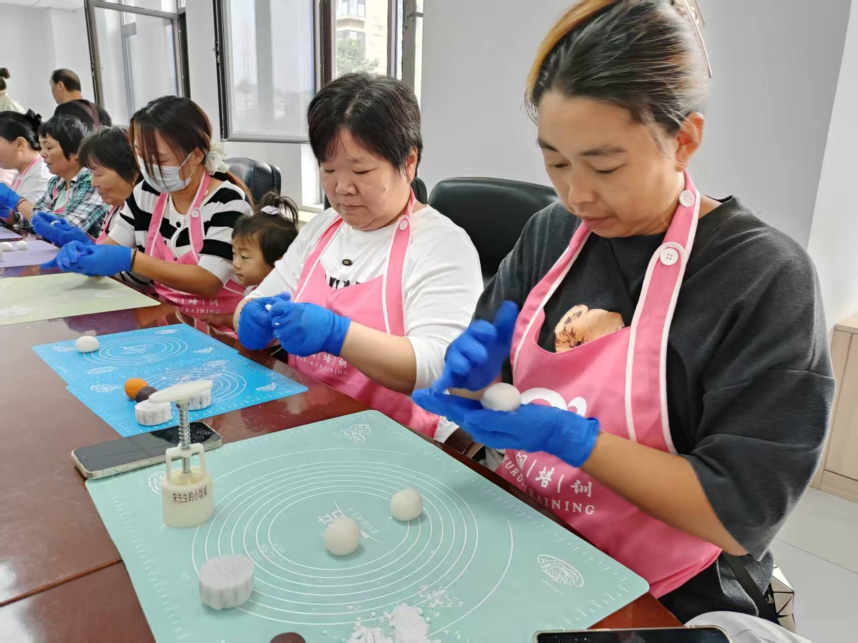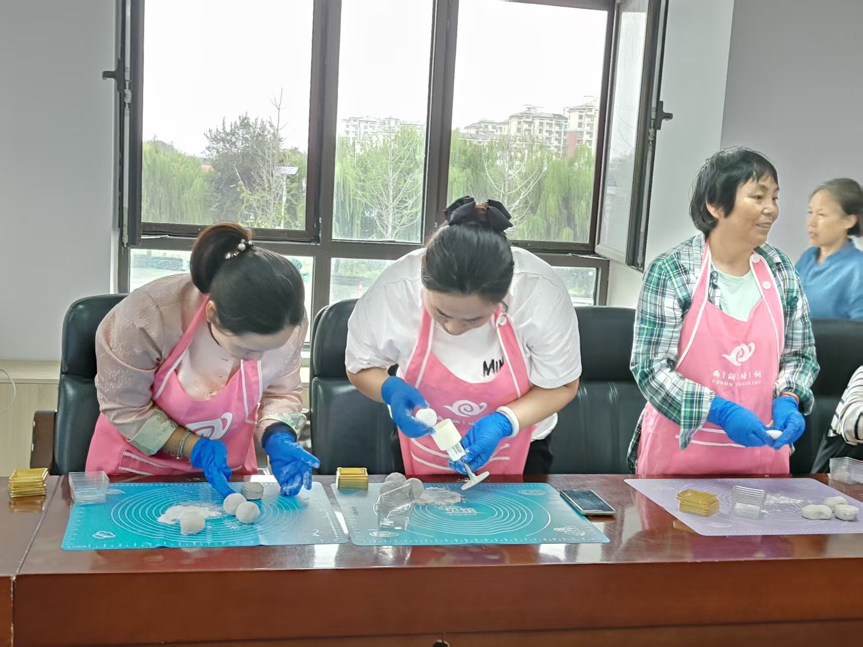 现场更是热闹又暖心,大人的巧思与孩子的童真相映成趣。专业老师手把手教学,从冰皮的软硬度把控,到馅料的包裹技巧,再到压模时“轻转慢压”的小窍门,连第一次动手的人都慢慢找到了感觉。女职工们和“文化两创”学员凑在一起,你帮我补点面团,我教你对齐花纹,有人还试着给月饼捏出小月牙装饰,把“创新”藏进细节里;一旁的小朋友踮着脚,在妈妈的手把手指导下攥着小团冰皮,学着大人的样子慢慢裹馅,虽动作笨拙,却眼神专注,最后歪歪扭扭地完成了属于自己的作品,举着向妈妈炫耀时,小脸上满是骄傲。这哪里是做月饼,分明是一堂鲜活的非遗实践课,让“文化两创”的理念,在指尖协作与亲子互动中落地生根。
