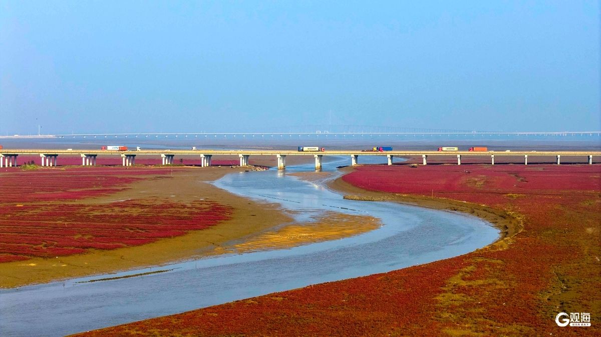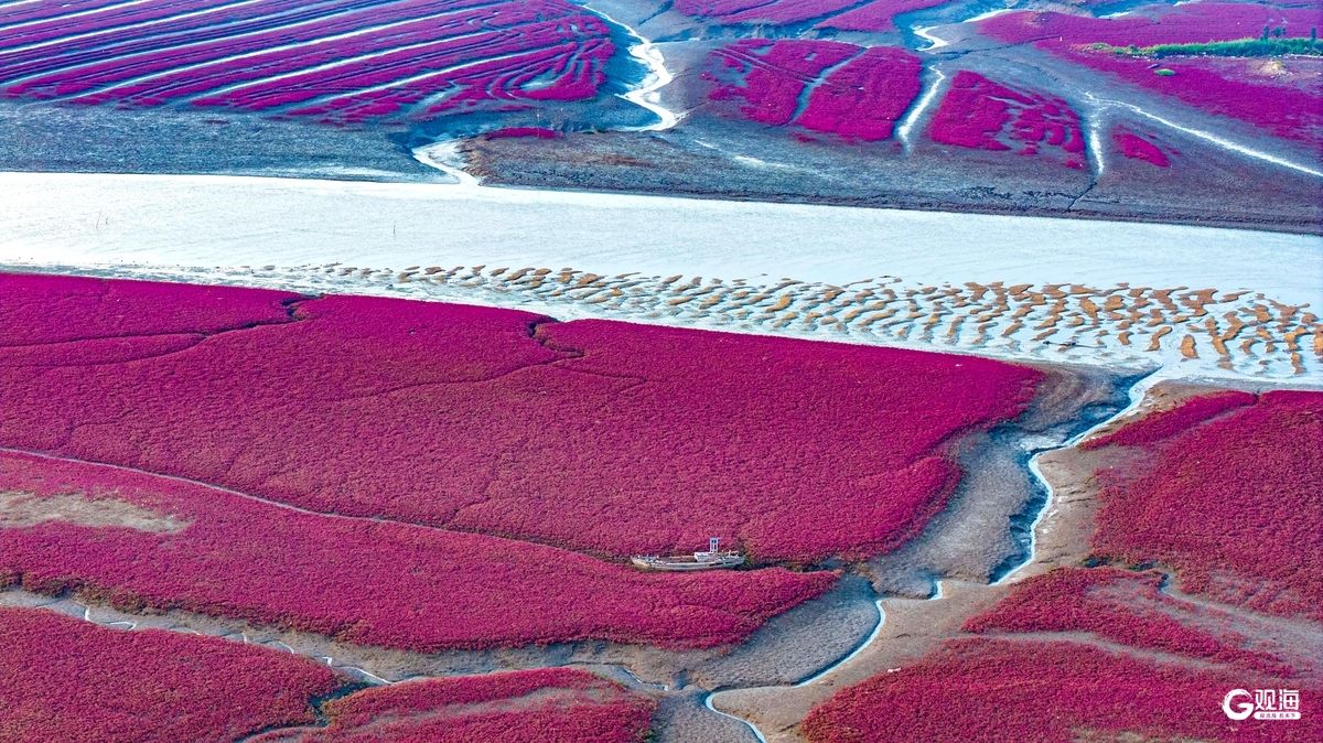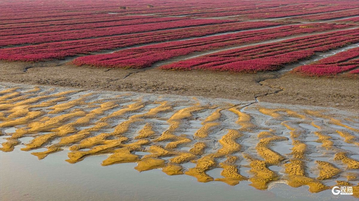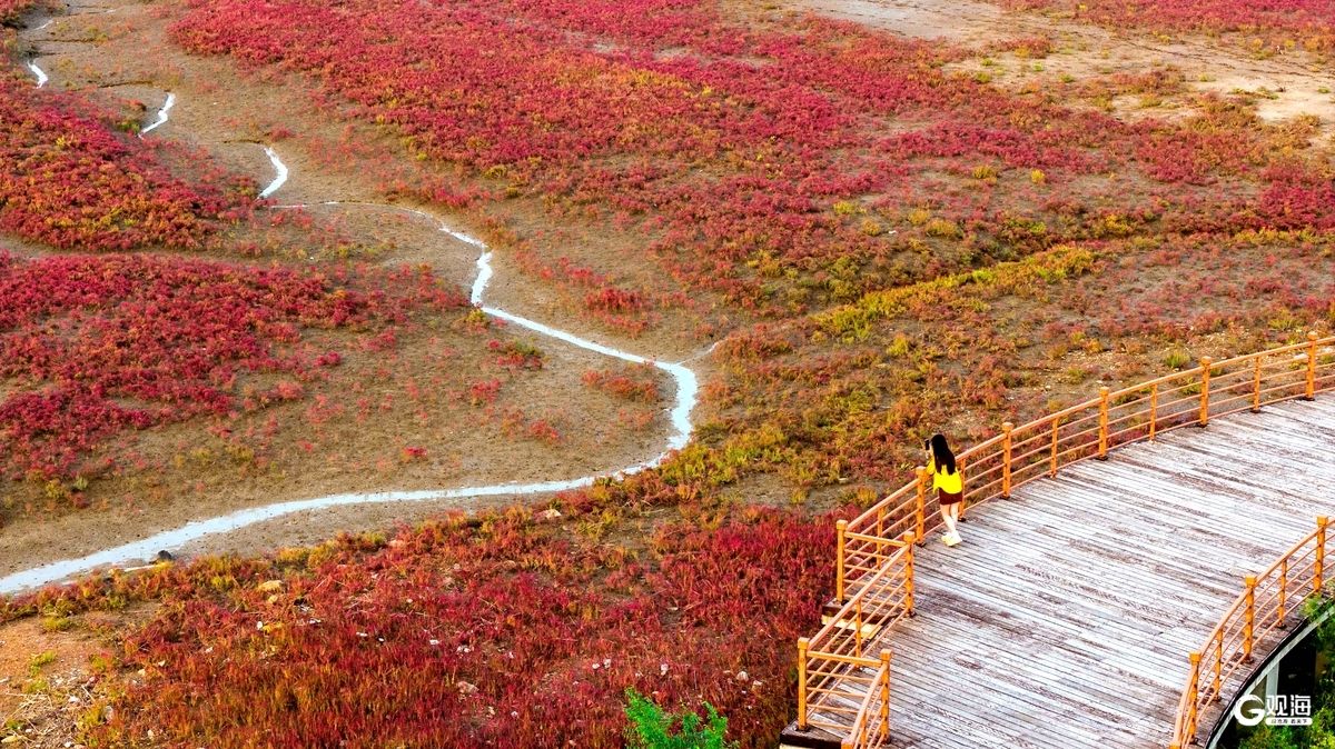 青岛日报社/观海新闻9月30日讯 近日,青岛西海岸新区红石崖街道依偎的胶州湾湿地红海滩,迎来一年中的最佳观赏期。退潮后,绵延的碱蓬草宛如片片红毯,色彩靓丽,与深褐色的潮沟和入海的河水一起,编织出一幅幅色彩斑斓的生态画卷。
