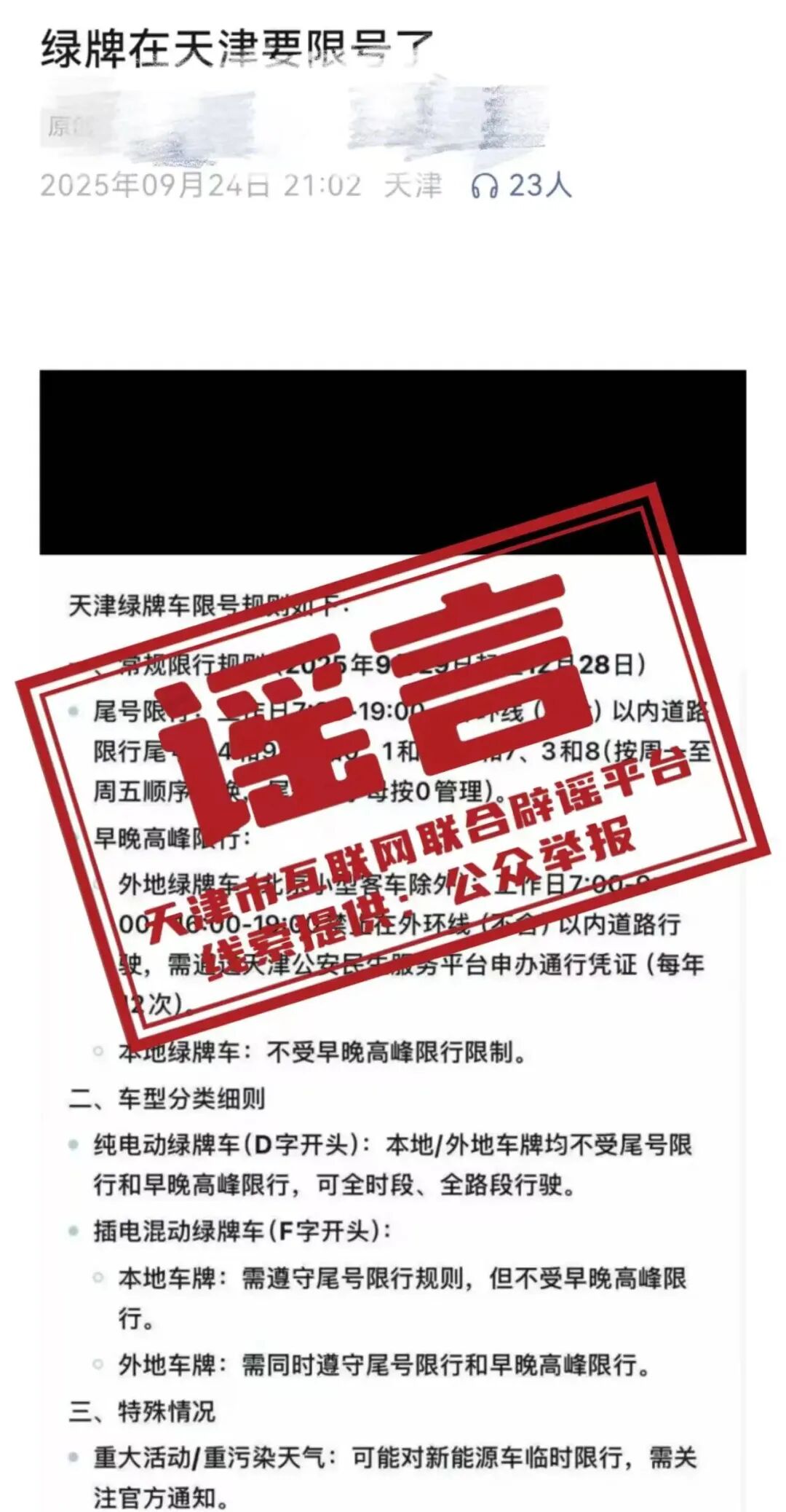 经向天津市公安交管部门核实,相关内容均为不实信息,按照2025年3月21日天津市公安局发布的《关于继续实施机动车限行交通管理措施的通告》,新能源小客车(以车辆登记信息为准)不受机动车尾号及外埠、区域号牌小客车高峰限行措施限制。