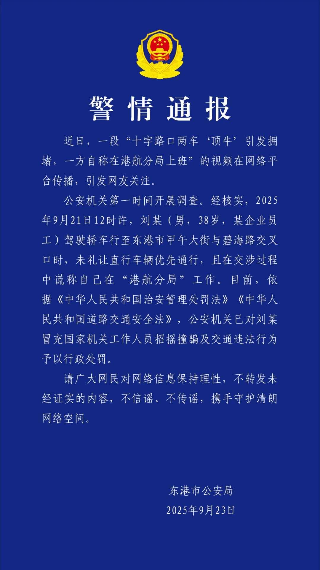 刘某冒充国家机关工作人员招摇撞骗!警方通报→ 2025-09-24 12:30 “环球网”微信公众号、“东港警事”微信公众号 0 9月23日,辽宁东港警方通报“两车‘顶牛’引发拥堵”:已对刘某冒充国家机关工作人员招摇撞骗及交通违法行为予以行政处罚。 责任编辑:荣潇