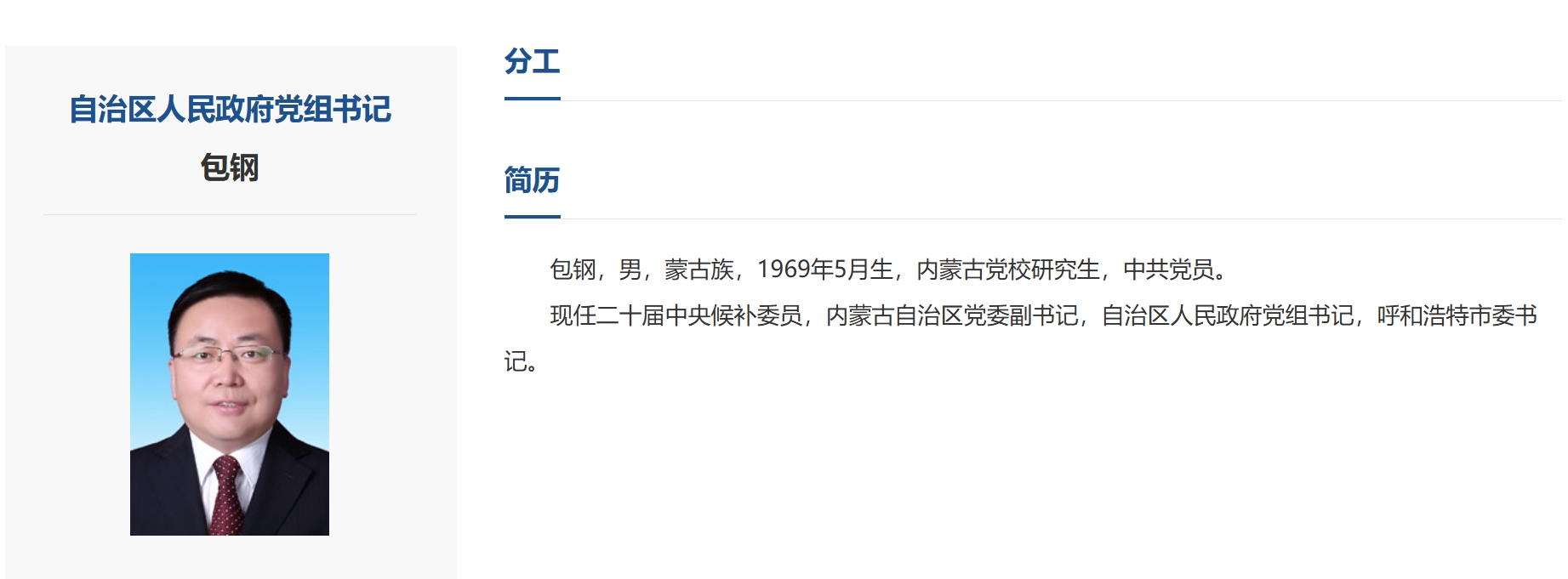 内蒙古自治区人民政府网更新后显示,包钢已任内蒙古自治区党委副书记,自治区人民政府党组书记。