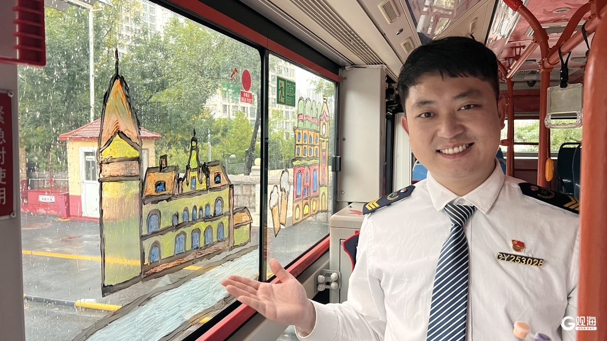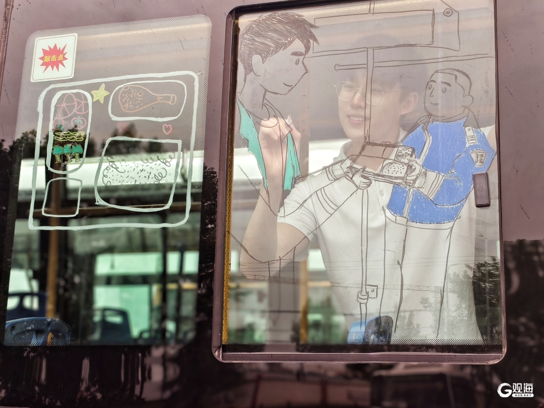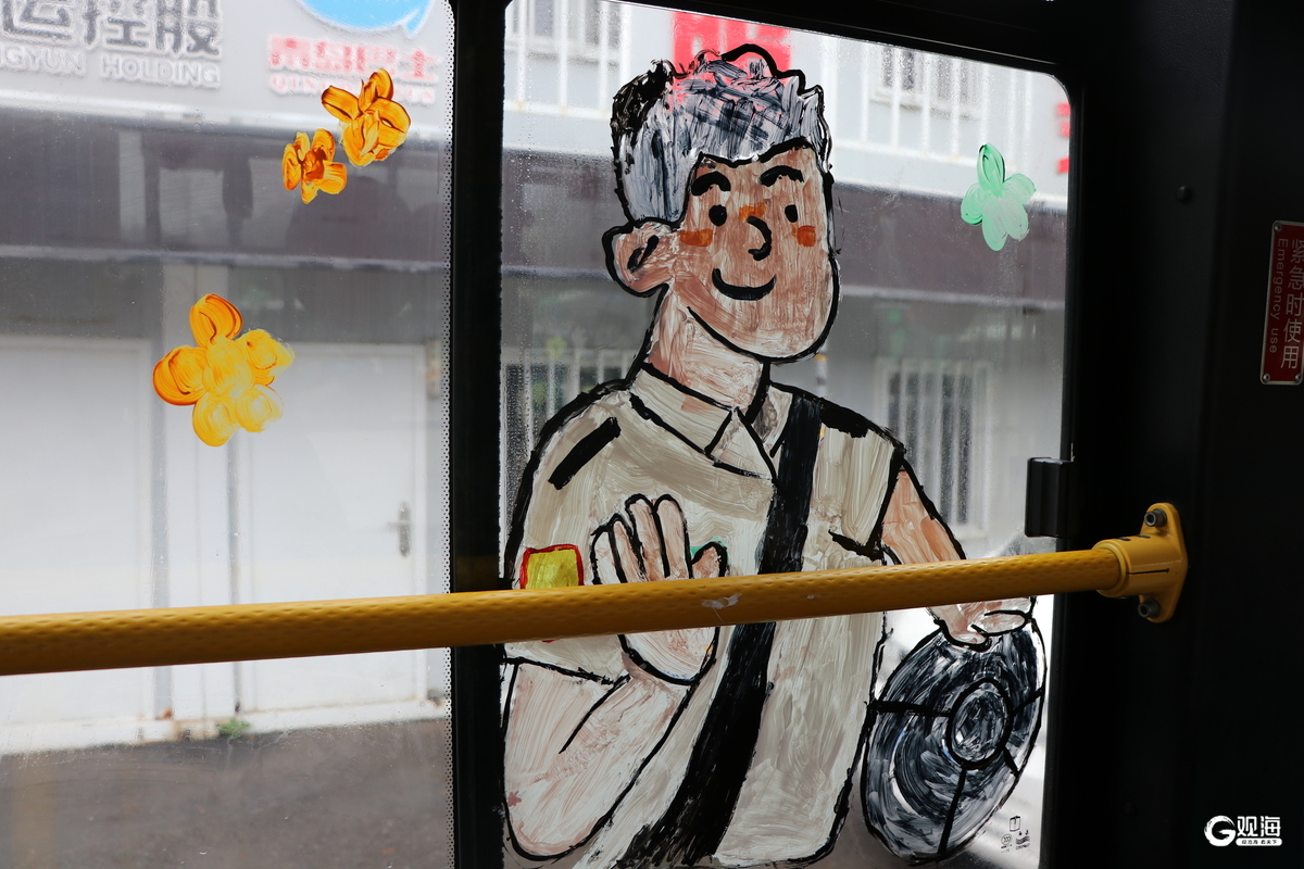 公交驾驶员可爱的卡通形象被画在了车窗上