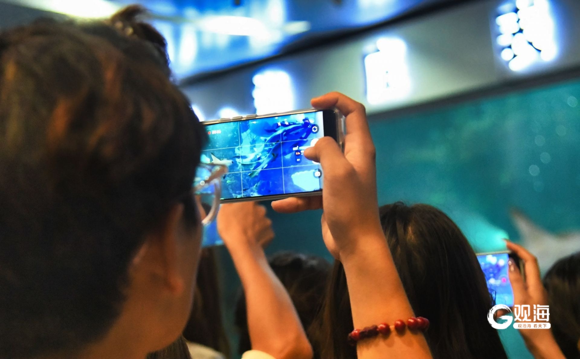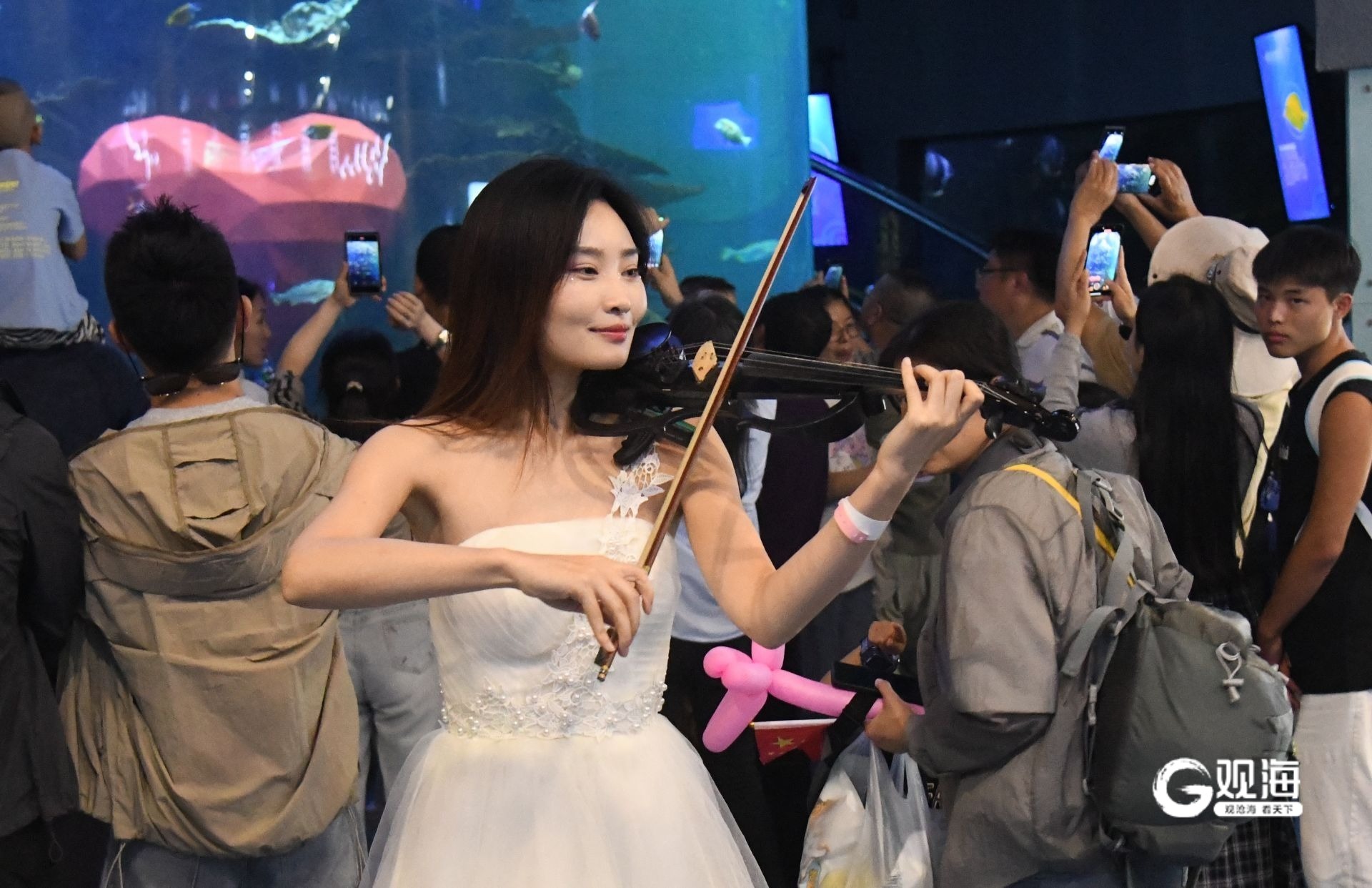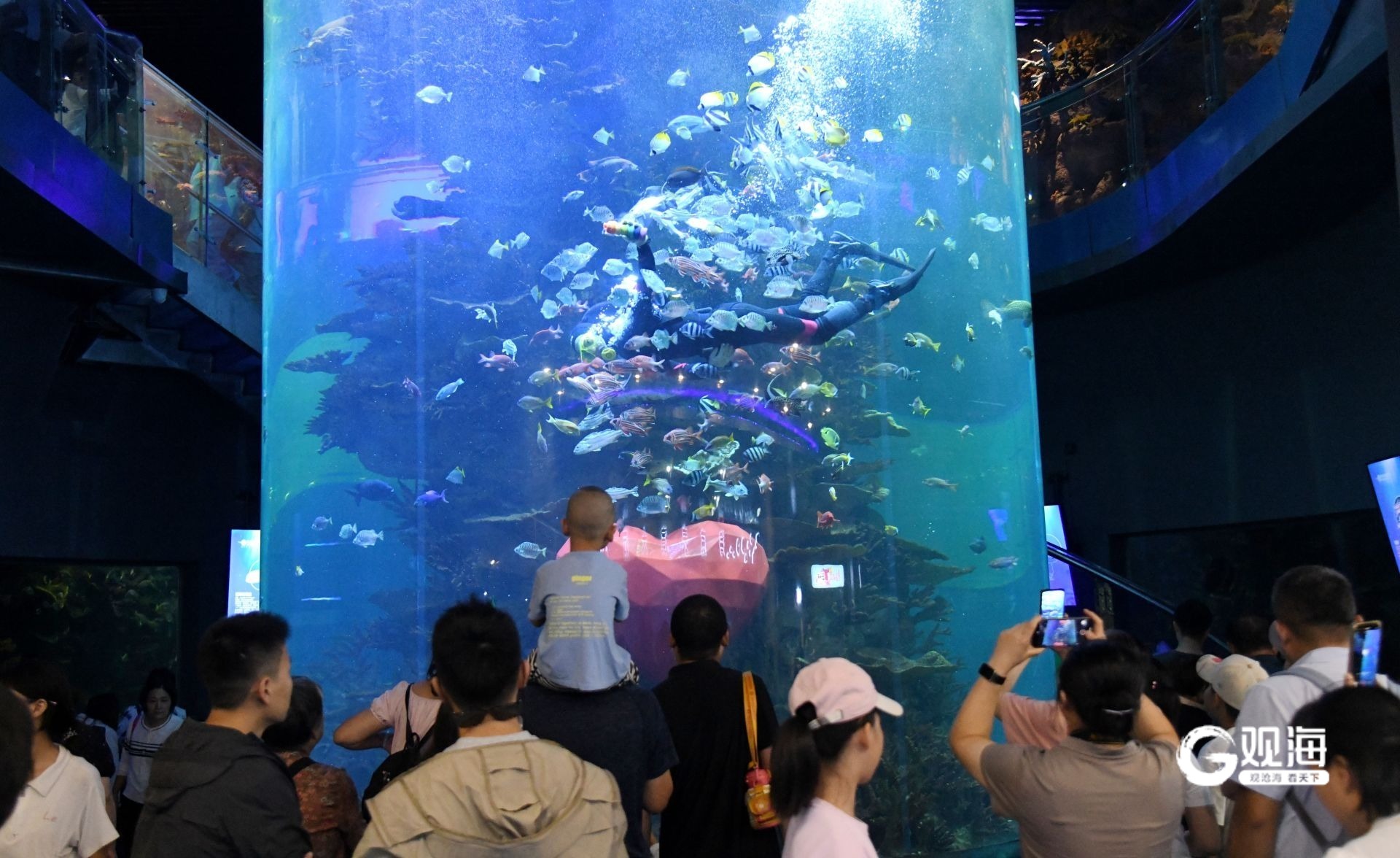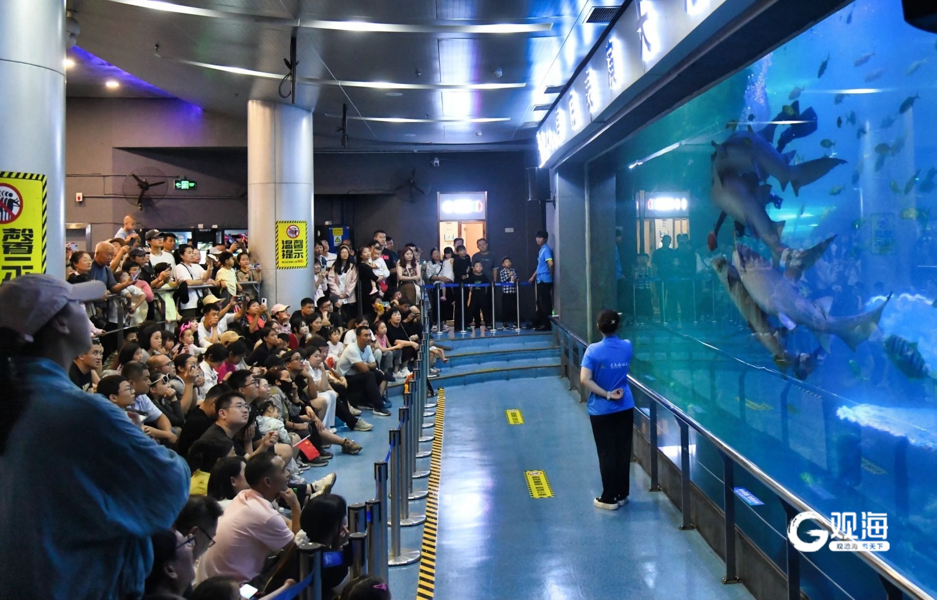 日间的海洋馆化身为欢乐的海洋。在深海泡泡秀现场,里三层外三层的游客将表演区围得水泄不通,孩子们争相与俏皮的“泡泡公主”和憨态可掬的“显眼包”北极熊互动合影,欢声笑语不绝于耳。更为震撼的是海底表演大厅内的水下红歌快闪,当熟悉的旋律在蔚蓝的海水前响起,巨大的观景玻璃前早已被热情的游客层层包围,不少人只能踮起脚尖,用手机记录下这激动人心的一刻。“氛围太燃了!虽然人多,但这种大家一起欢呼的感觉特别有节日气氛。”