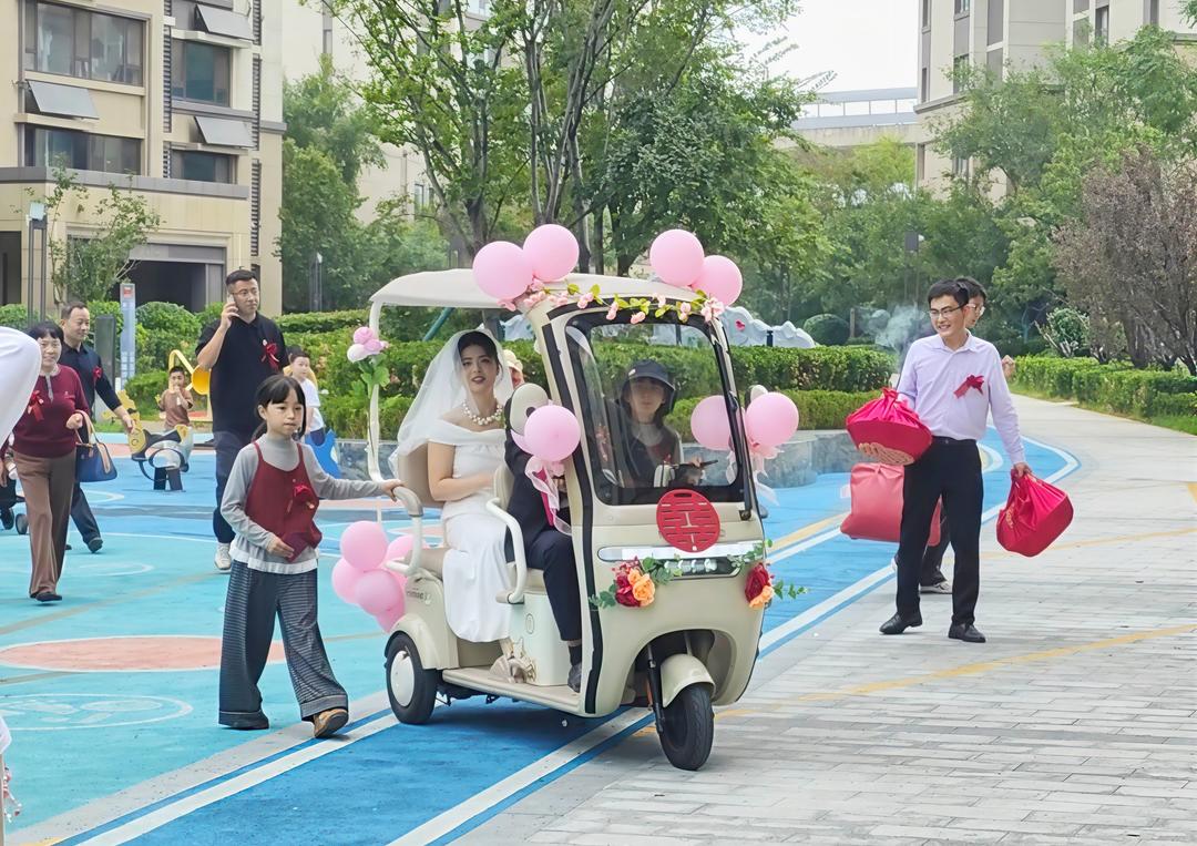 香槟色的电动三轮车,车头贴一个红“双喜”,车身绑上气球和鲜花,就成了亮眼的婚车。