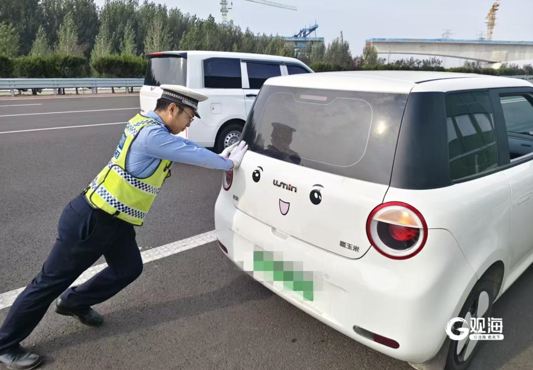 10月1日14时许,董胶高速公路大队五中队民辅警在沈海高速黄岛服务区疏导交通时,发现在服务区匝道入口不远处,一辆轿车打着双闪停在路边。经了解,该车因电量耗尽无法移动,民警迅速在后方做好警示提醒,并协助驾驶人将车推移至服务区内进行充电,及时消除了安全隐患。