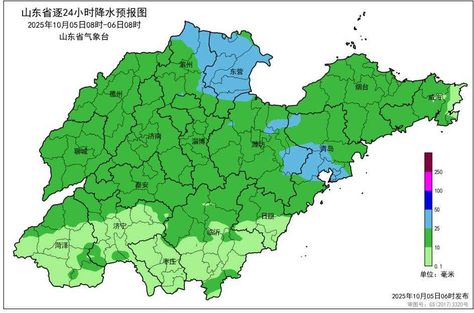 山东省气象台于2025年10月5日06时00分发布海上大风警报:预计5日白天,渤海和渤海海峡北风5~6级增强到7级阵风8~9级,黄海北部北风5~6级,黄海中部偏东风5~6级;5日夜间,渤海和渤海海峡北风7级阵风8~9级减弱到6~7级阵风8级,黄海北部北风5~6级,黄海中部偏东风5~6级。
