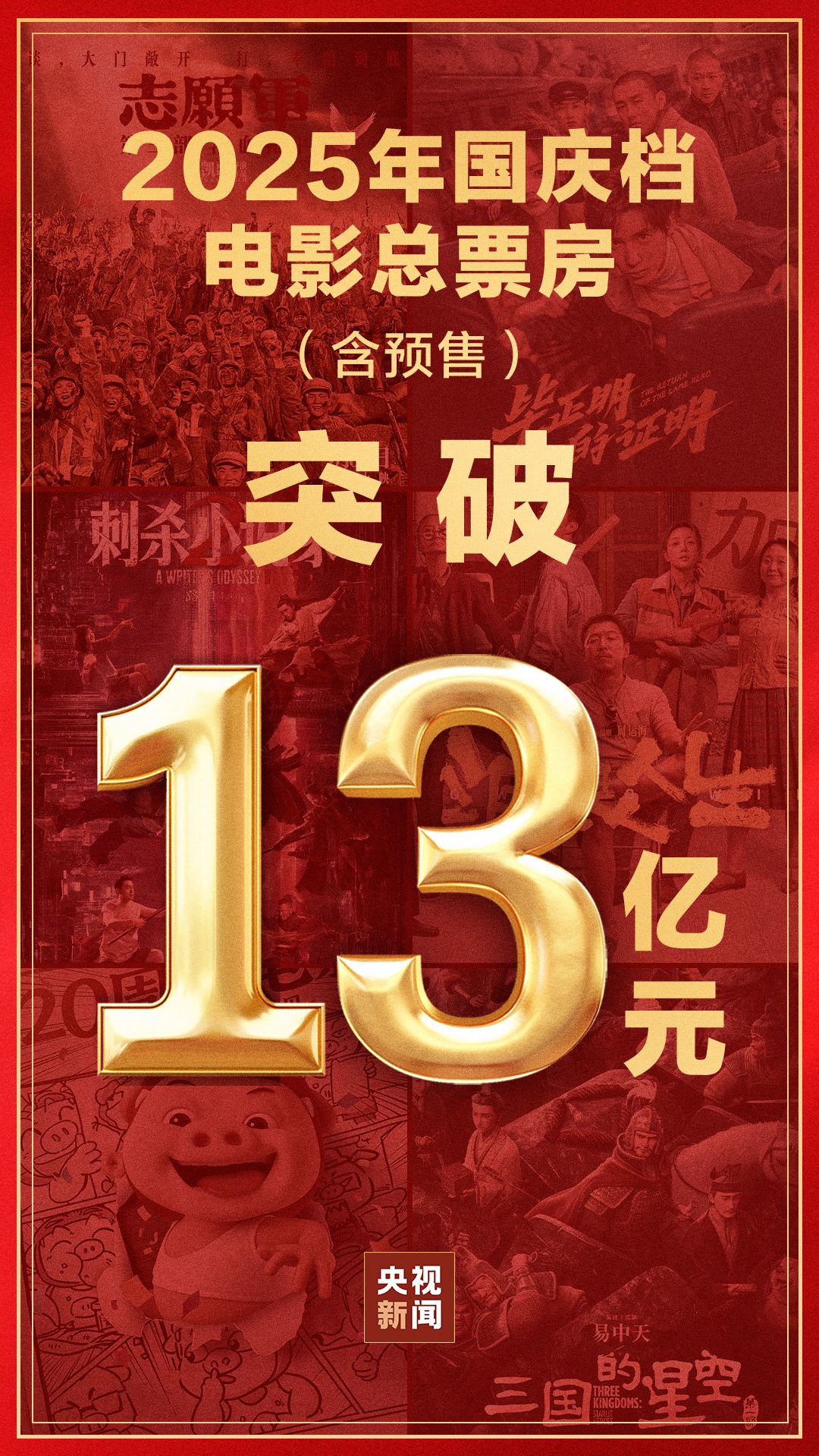 2025年国庆档电影总票房破13亿 2025-10-05 17:18 央视新闻客户端 0 据网络平台数据 截至10月5日17时16分 2025年国庆档电影总票房(含预售) 破13亿! 《志愿军:浴血和平》 《731》《刺杀小说家2》 列前三位 责任编辑:程雪涵
