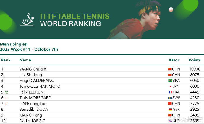 国际乒联公布2025年第41周排名。男单方面,王楚钦凭借在WTT中国大满贯中夺冠,世界排名积分从9425分跃升至10900分,成为男子乒坛历史上首位积分破万的运动员,刷新了国际乒联现行积分规则下的最高纪录。女单方面,“万分女王”孙颖莎继续领跑世界排名。