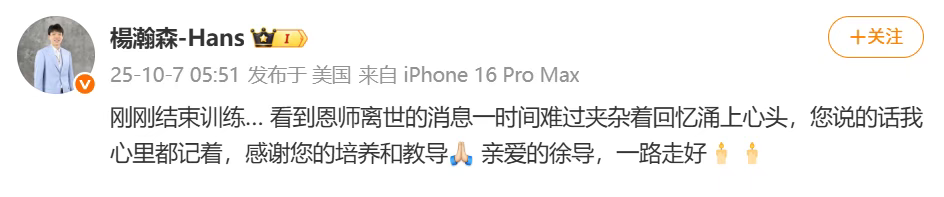 北京时间10月7日早,身在美国的杨瀚森发文缅怀恩师徐长锁:“刚刚结束训练…看到恩师离世的消息,一时间难过夹杂着回忆涌上心头,您说的话我心里都记着,感谢您的培养和教导。亲爱的徐导,一路走好。”