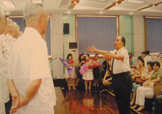 离休后,彭奇愚指导老同志合唱团排练抗战歌曲。