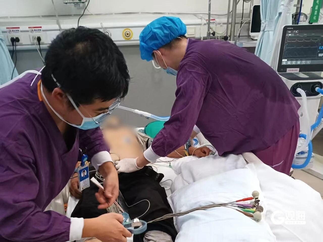 一名22岁的青年患者因多脏器功能衰竭,血压进行性下降至80/44mmHg,氧饱和度为92%,意识不清。面对紧急情况,市南病区团队迅速启动抢救程序,立即进行扩容补液、CVC穿刺等一系列抢救措施,经过近3个小时的积极处置,患者神志转清、生命体征稳定。一位患者突发呕血伴休克,崂山病区团队在快速扩容输血、止血、升压维持循环稳定的同时,敏锐判断急性上消化道出血的可能,立即联系消化内科医师携床旁胃镜设备进行检查,介入医学中心团队随时待命。胃镜下,一个正在喷血的胃溃疡病灶赫然显现,医护团队默契配合,迅速完成内镜下止血治疗,患者生命体征逐渐平稳。