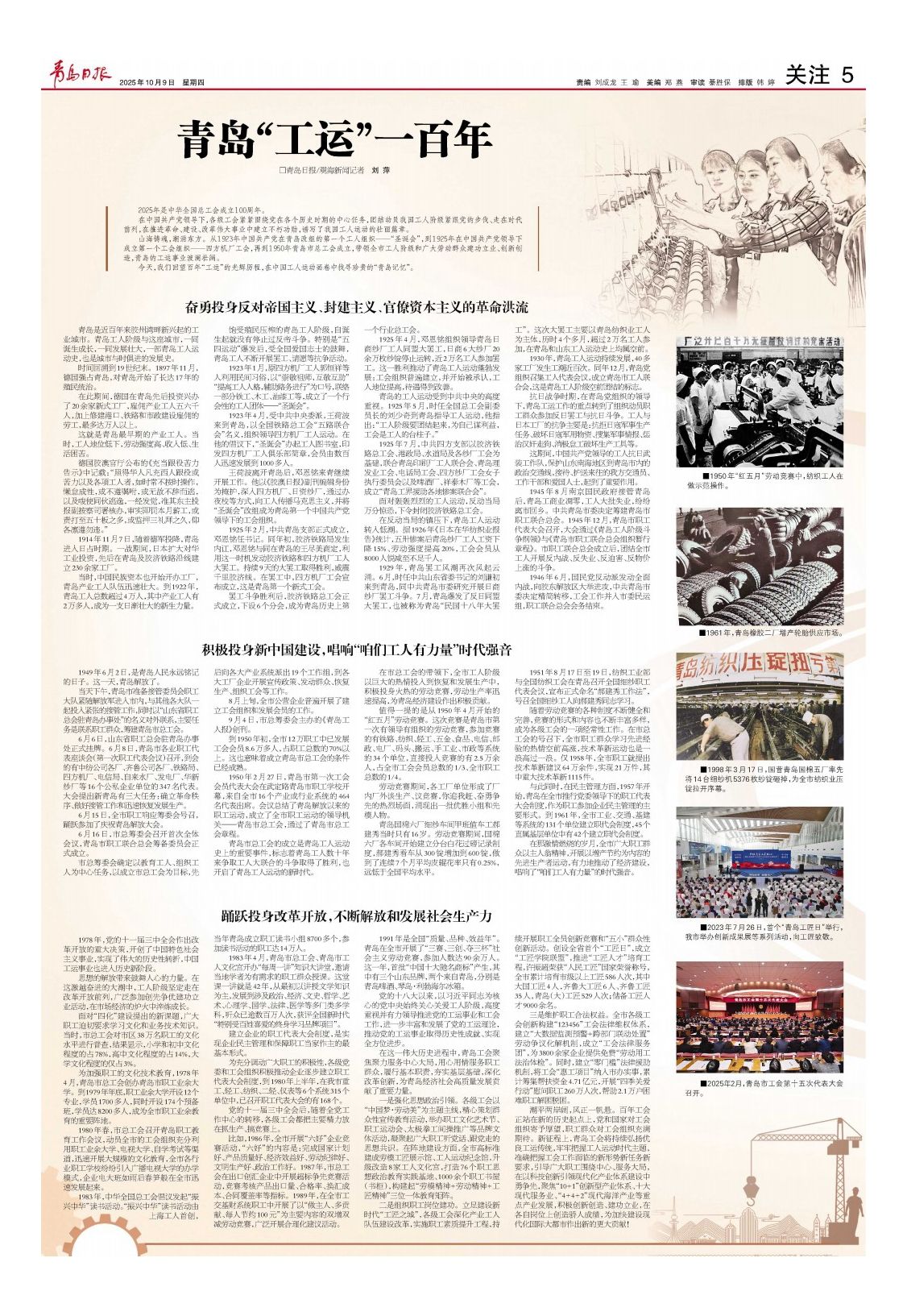 山海铸魂,潮涌东方。从1923年中国共产党在青岛改组的第一个工人组织——“圣诞会”,到1925年在中国共产党领导下成立第一个工会组织——四方机厂工会,再到1950年青岛市总工会成立,带领全市工人阶级和广大劳动群众建功立业、创新创造,青岛的工运事业波澜壮阔。