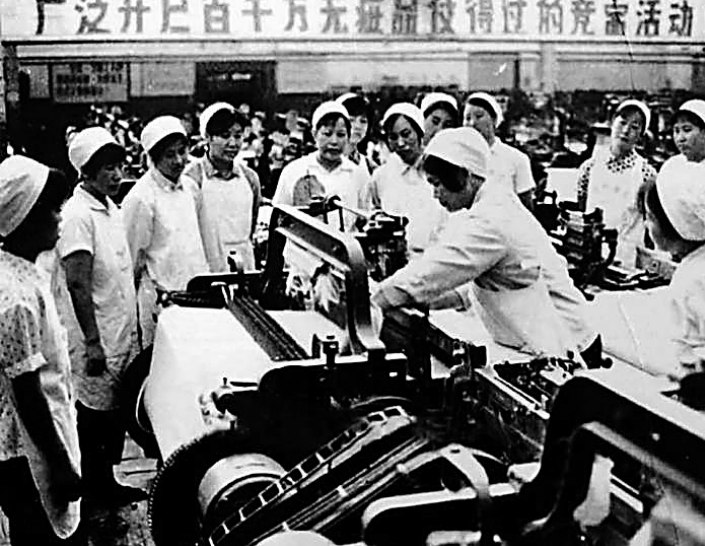 1950年“红五月”劳动竞赛中,纺织工人在做示范操作。