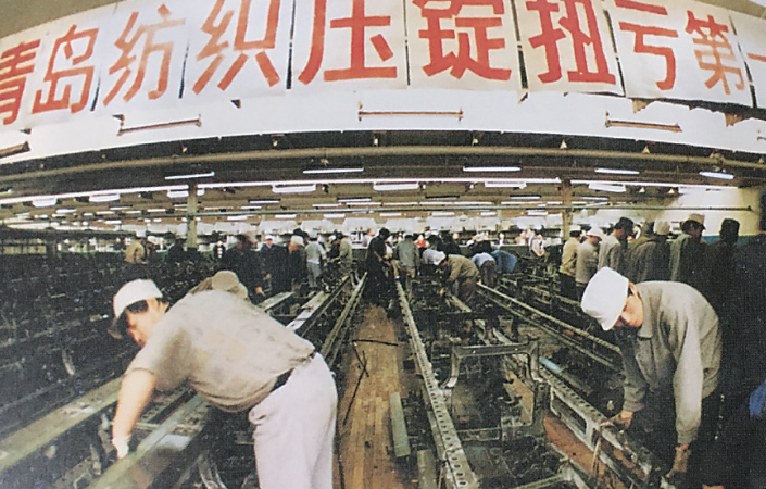 1998年3月17日,国营青岛国棉五厂率先 将14台细纱机5376枚纱锭砸掉,为全市纺织业压 锭拉开序幕。