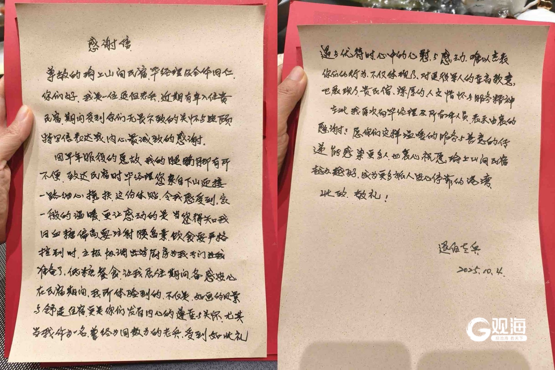 老兵在信中写道:“在青岛入住民宿期间,我所体验到的不仅是如画的山景与舒适的住宿,更是你们发自内心的尊重与关怀。”他表示,作为一名退役军人,受到如此礼遇,心中的欣慰与感动难以言表,并称赞民宿的服务“展现了深厚的人文情怀与服务精神”。