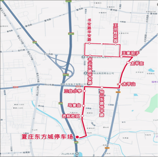 往夏庄东方城停车场方向:自“书安路华安路”返程站,沿书安路、华安路、书云东路、王沙路、仙山东路、华安路、乐水路、乐水支路至“夏庄东方城停车场”站止。