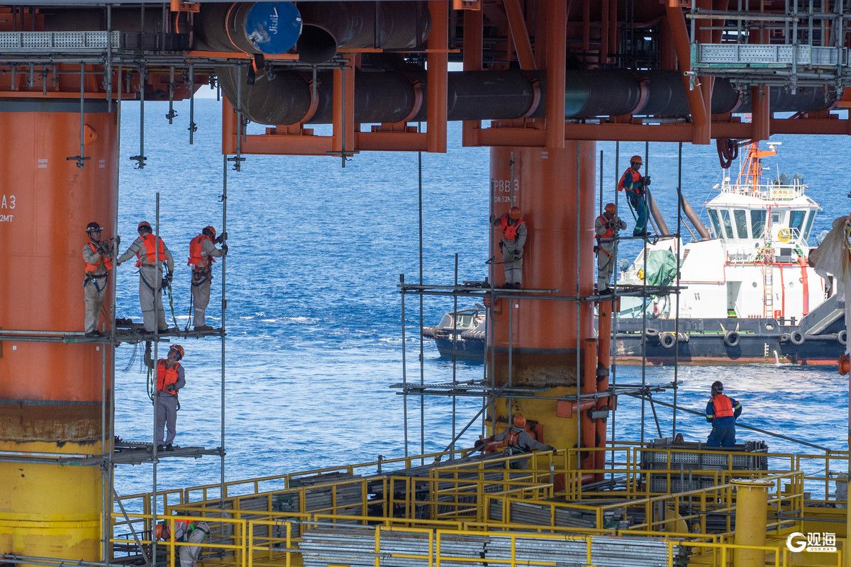 惠州25-8B钻采平台上部组块完成浮托后,工作人员开展桩腿脚手架搭设,为后续焊接做好准备