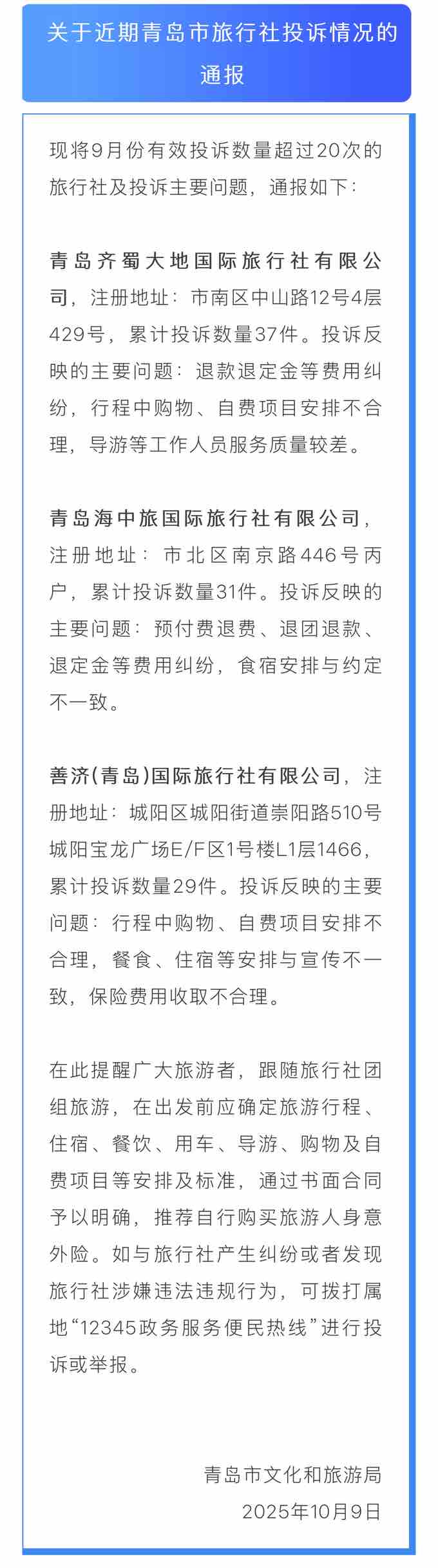 青岛日报社/观海新闻10月9日讯 9日,市文化和旅游局发布《关于近期青岛市旅行社投诉情况的通报》,对2025年9月份有效投诉数量超过20次的旅行社及投诉主要问题通报如下: