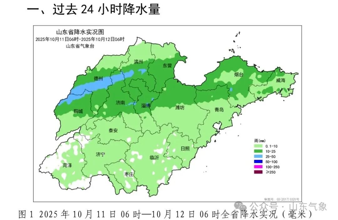 10 月 11 日 06 时至 12 日 06 时,全省大部地区出现降水,平均降水量 8.0(毫米,下同),折合水量约 12.6 亿方(图 1)。各市平均:德州 16.2、淄博 15.4、东营14.4、济南 14.4、滨州 14.0、聊城 12.4、烟台 12.2、潍坊 9.9、威海 7.9、青岛 6.1 和泰安 1.6,其他市降水量不足 1.0。县(市、区)平均降水量超过 25.0的 4 个,10.0—25.0 的 43个,5.0—10.0的 16 个,前 3位的是:德州夏津 32.6、聊城临清28.8和德州平原28.3。所有站点超过25.0的99个站,10.0—25.0 的659 个,5.0—10.0的 289个,降水量前 3位的是:德州夏津王庄闸 46.0(水文站) 、德州夏津 46.0(水文站)和德州渤海路小学 42.2。今年以来全省平均降水量808.0,较常年同期偏多 191.7(31%)。 6 月以来全省平均降水量 702.9,较常年同期偏多 209.3(42%)。9 月以来全省平均降水量 296.1,较常年同期偏多 222.4(301.5%)。