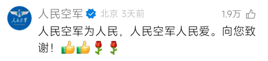 10月10日,陆遥将记录这段经历的视频发布到网上后,引发网友热议,大家纷纷表示:“先辈的精神与奉献,我们应共同传承和守护。”人民空军官方账号也在视频下留言回应:“人民空军为人民,人民空军人民爱。向您致谢!”这条简短的致谢在短时间内获得数万网友点赞,许多人表示这是军民鱼水情的生动体现。