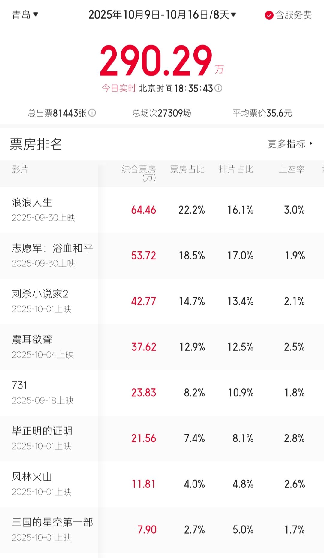 目前,国庆档的几部头部影片依然保持着较强的市场号召力,排片占比和上座率都相对稳定。具体来说,《浪浪人生》凭借其合家欢属性,依然是许多观众的首选,其青岛累计票房已突破400万元。此外,《志愿军:浴血和平》这部青岛国庆档票房冠军,也因其宏大的战争场面和历史厚重感,保持着领先的位置。