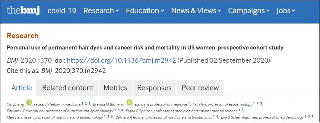 少用永久性染发剂,2020年,发表在《英国医学杂志》上一项大型前瞻性队列研究发现,使用永久染发剂与皮肤癌、乳腺癌、卵巢癌、淋巴瘤发病风险增加有关。