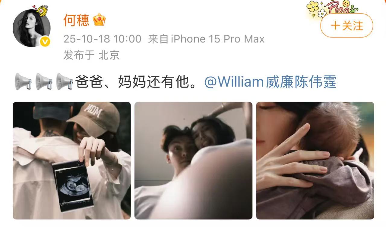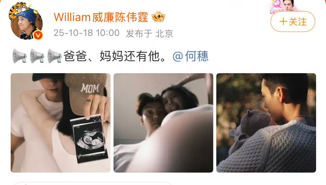 10月18日,演员陈伟霆在个人微博晒出多张合影,称:“爸爸、妈妈还有他。”并@模特何穗,官宣两人结婚生子。