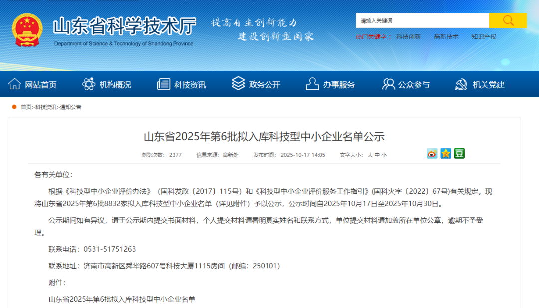 根据《科技型中小企业评价办法》(国科发政〔2017〕115号)和《科技型中小企业评价服务工作指引》(国科火字〔2022〕67号)有关规定。现将山东省2025年第6批8832家拟入库科技型中小企业名单(详见附件)予以公示,公示时间自2025年10月17日至2025年10月30日。