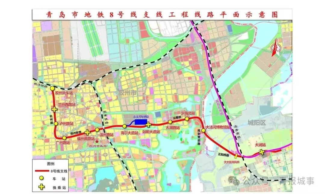 在青岛地铁线网中,8号线串联青岛主城区、城阳区和胶州市,是连接青岛胶东国际机场、北岸城区、东岸城区的快速骨干线路。8号线全长61.4公里,共设18座车站,起点自胶州北站,终点至五四广场。
