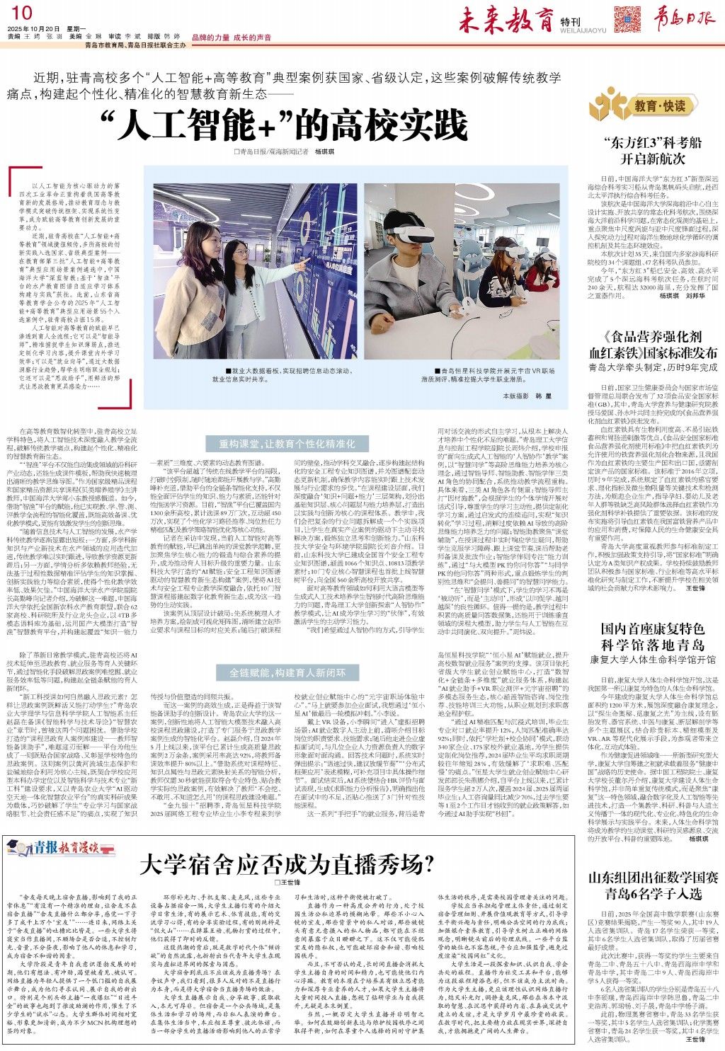近期,驻青高校在“人工智能+高等教育”领域捷报频传,多所高校的创新实践入选国家、省级典型案例——在教育部第三批“人工智能+高等教育”典型应用场景案例遴选中,中国海洋大学“深蓝智教:基于‘智渔’平台的水产教育图谱自适应学习体系构建与实践”获批。此前,山东省高等教育学会公布的2025年“人工智能+高等教育”典型应用场景55个入选案例中,驻青高校占据15席。