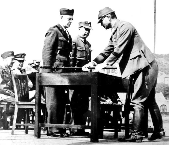陈宝仓(中)主持青岛地区日军投降仪式现场。
