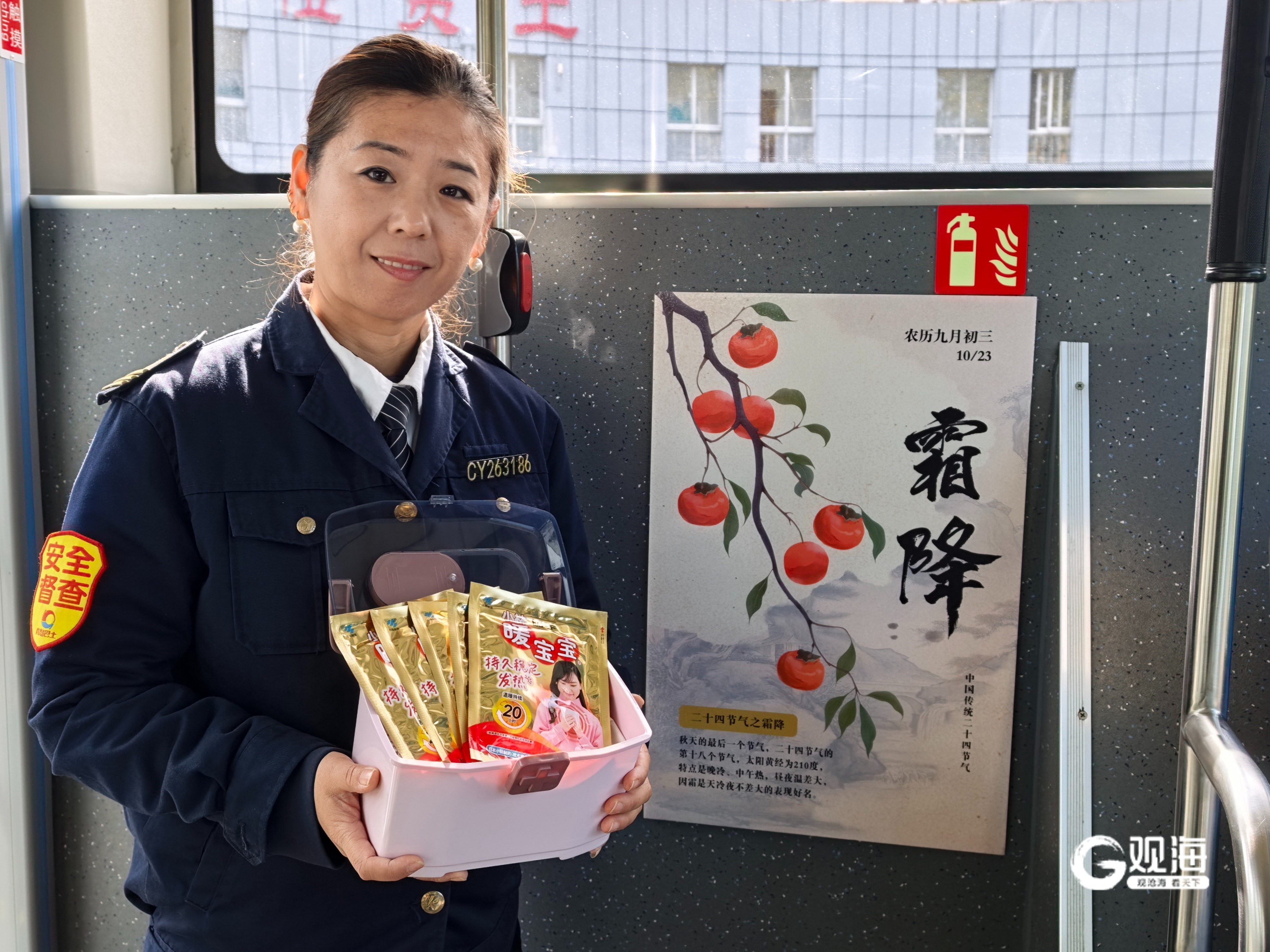 此外,驾驶室旁设置“霜降养生小贴士”展板,“霜降吃了柿,不流鼻涕咯”“天冷脚要暖,防寒莫忘补”等通俗谚语,既传递养生常识,又增添人文关怀。车厢醒目位置还张贴“霜降食补菜谱”,鲫鱼豆腐汤、萝卜排骨汤等家常菜品附带详细做法,实用性十足。“这菜谱太实用了,晚上给家人露一手!”乘客张阿姨一边用手机拍摄菜谱,一边笑着说道。