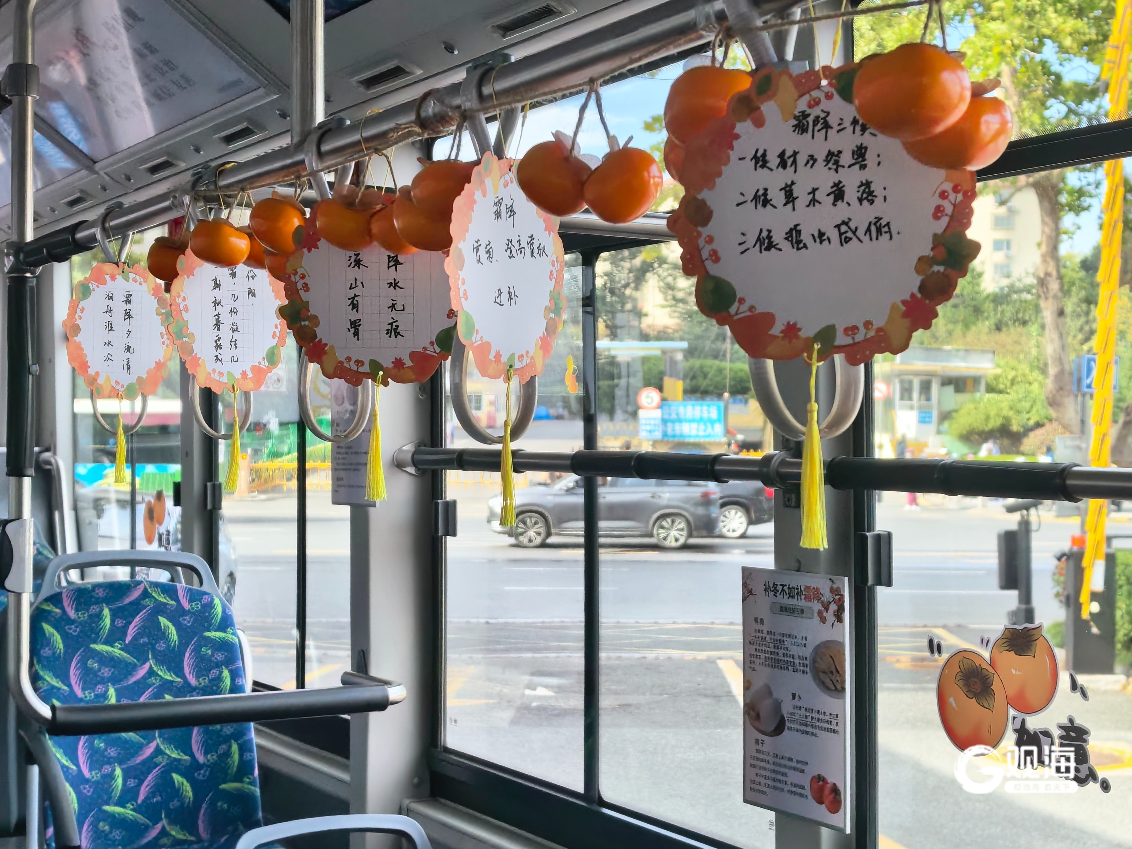 走进主题车厢,霜降氛围扑面而来。车窗张贴柿子贴纸,扶手悬挂仿真柿子串,既还原了“霜降红柿挂枝头”的节气景致,又暗含着“事事如意”的美好寓意。车厢拉手宝上,一张张“霜降诗句小卡片”格外吸睛,让行驶的公交车摇身一变成为“移动的文化小课堂”。