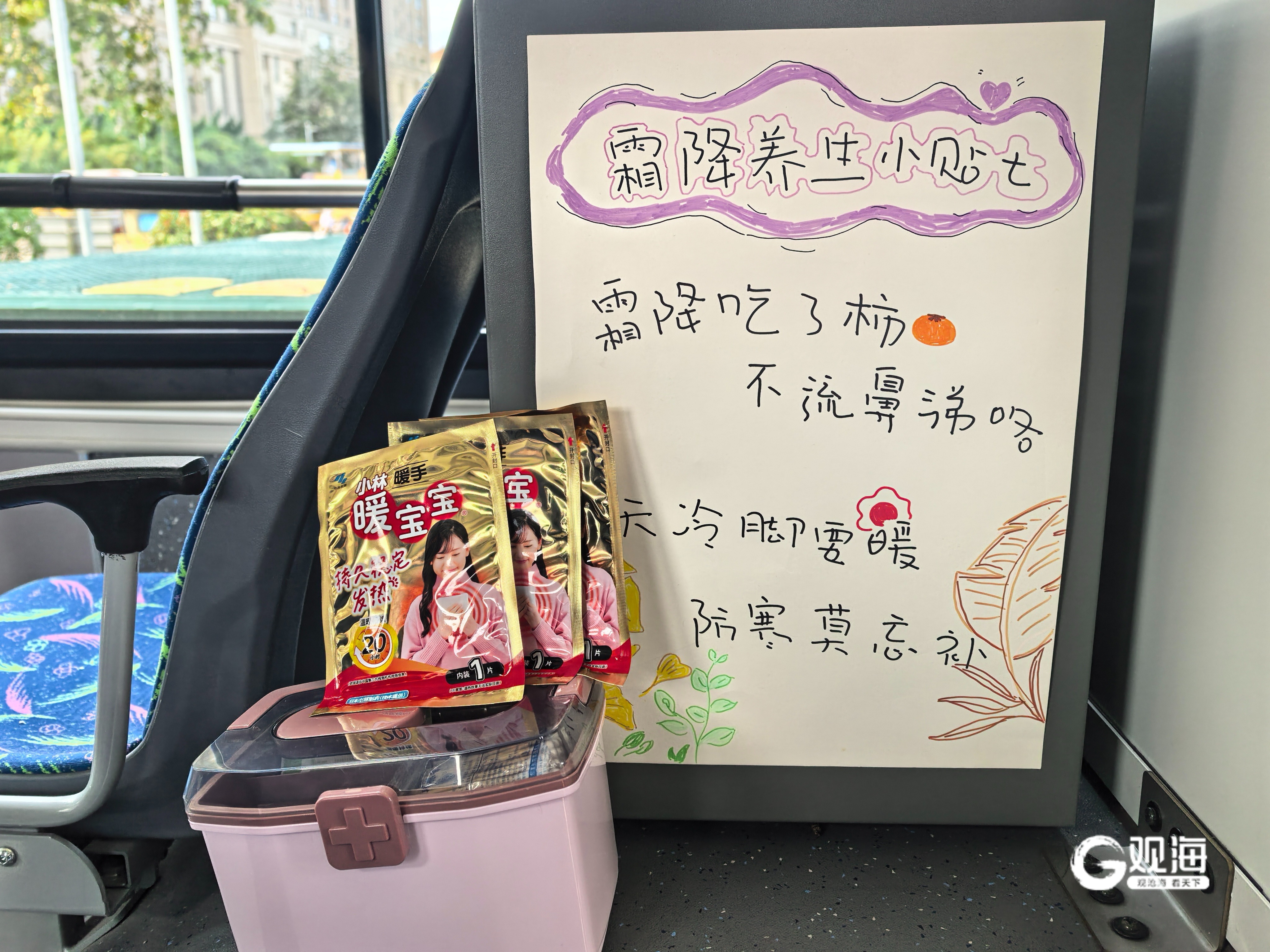 视觉装饰是“外衣”,便民服务才是“内核”。车厢中部的“霜降暖心箱”内,暖宝宝、一次性口罩、消毒湿巾整齐摆放。“最近早晚温差大,在站台等车时手脚都冻僵了,上车能拿到一片暖宝宝,心里特别暖和。”上班族李女士拿着刚取的暖宝宝感慨道。