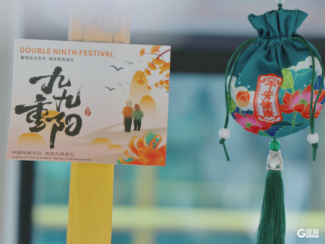 恰逢“敬老月”,张叶还将手拉包贴上了“敬老爱老”的卡片,并在车厢内悬挂了菊花、茱萸香囊,让主题车厢的布置更添一份温情。