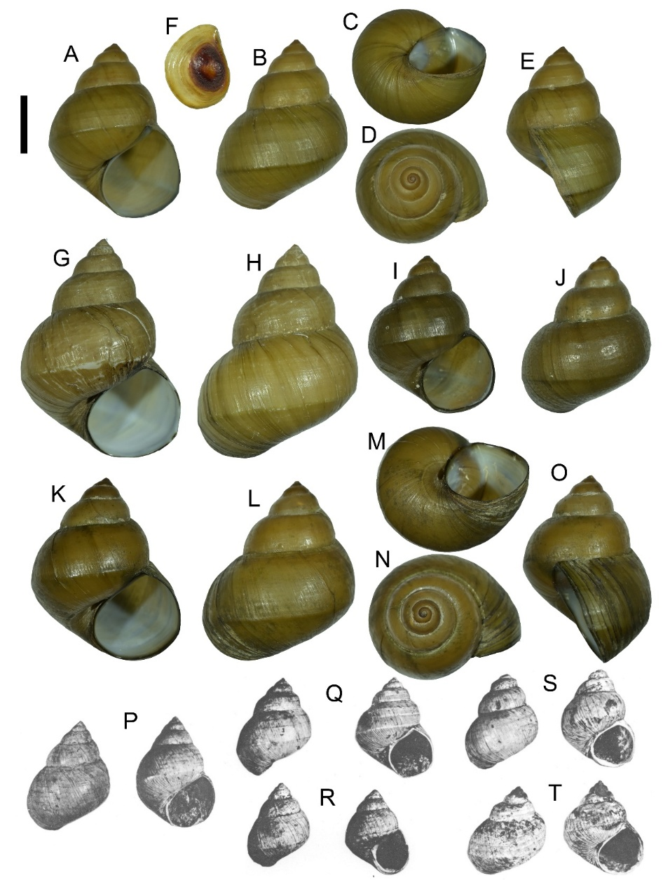 李四光娅田螺的现生个体贝壳(A—O)以及发现于第四纪沉积层的贝壳模式标本(P—T)。(中国科学院昆明动物研究所东南亚野生动物多样性课题组供图)