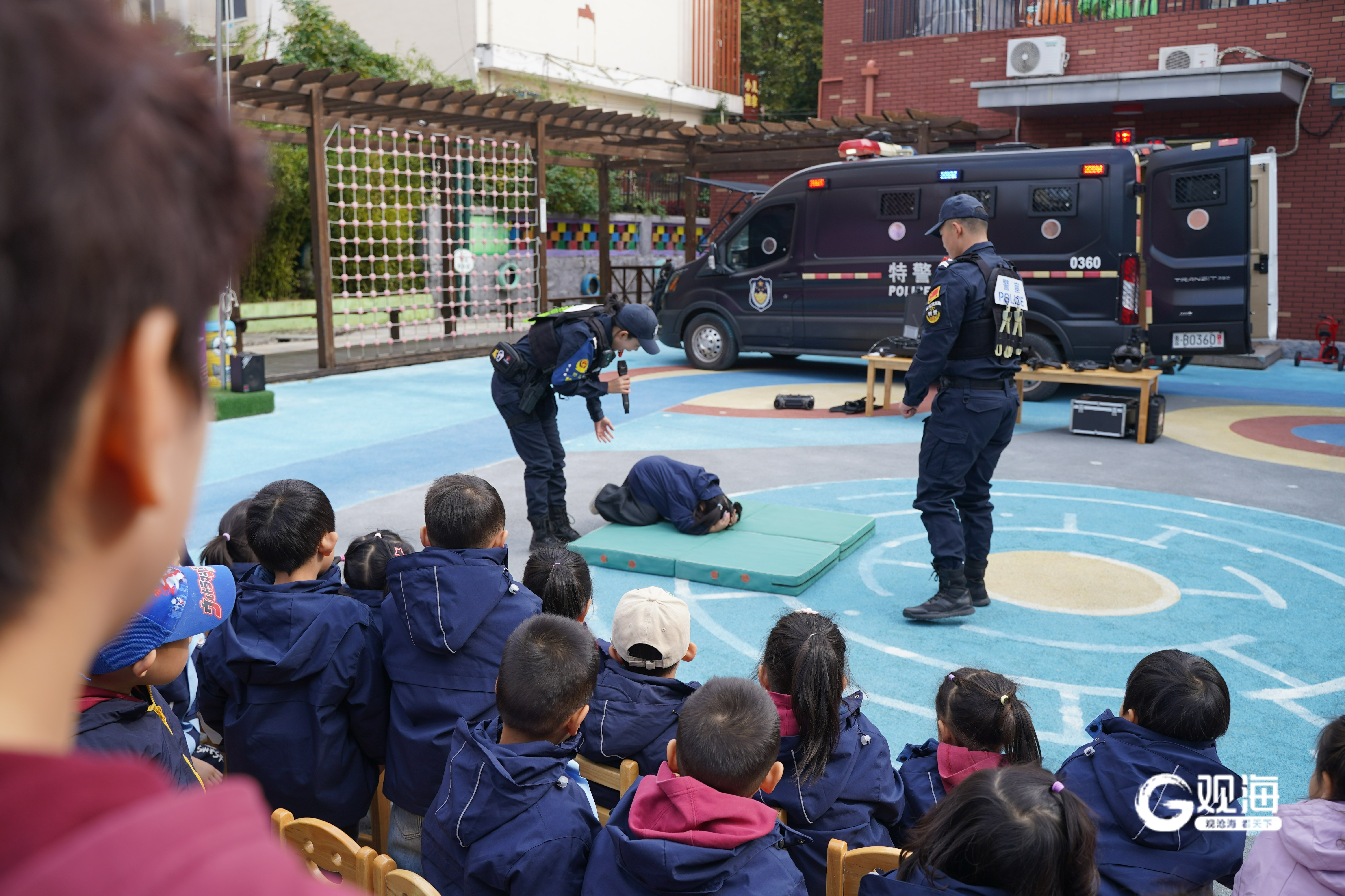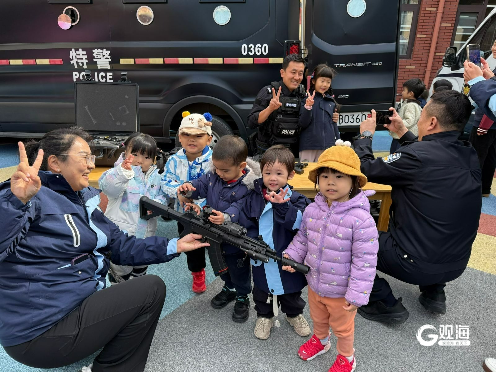 青岛日报社/观海新闻10月24日讯 当硬核特警遇上可爱萌娃,一场充满安全感的安全教育主题活动在幼儿园暖心开启!青岛市公安局特警支队“猎鲨突击队”携重装亮相,市北公安“青鸾特巡队”带来趣味安全课堂,让孩子们在欢乐中解锁安全技能,把幼儿园打造成了名副其实的“最安全游乐园”。