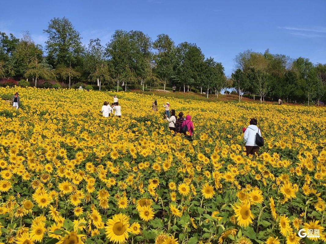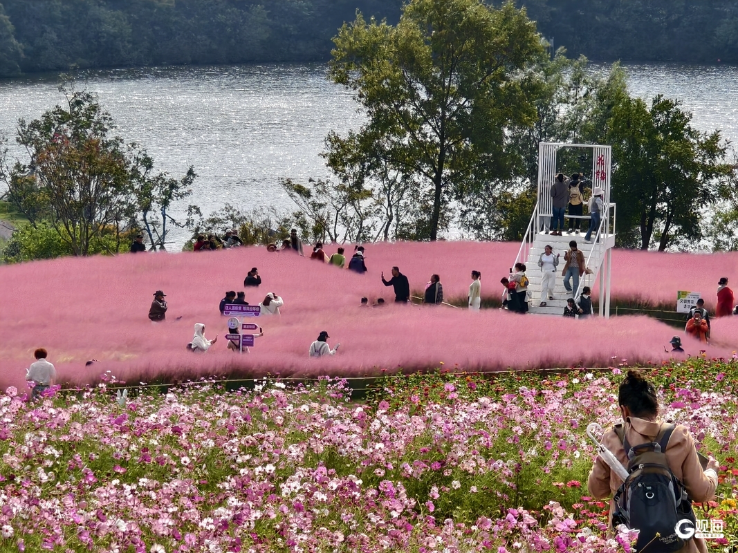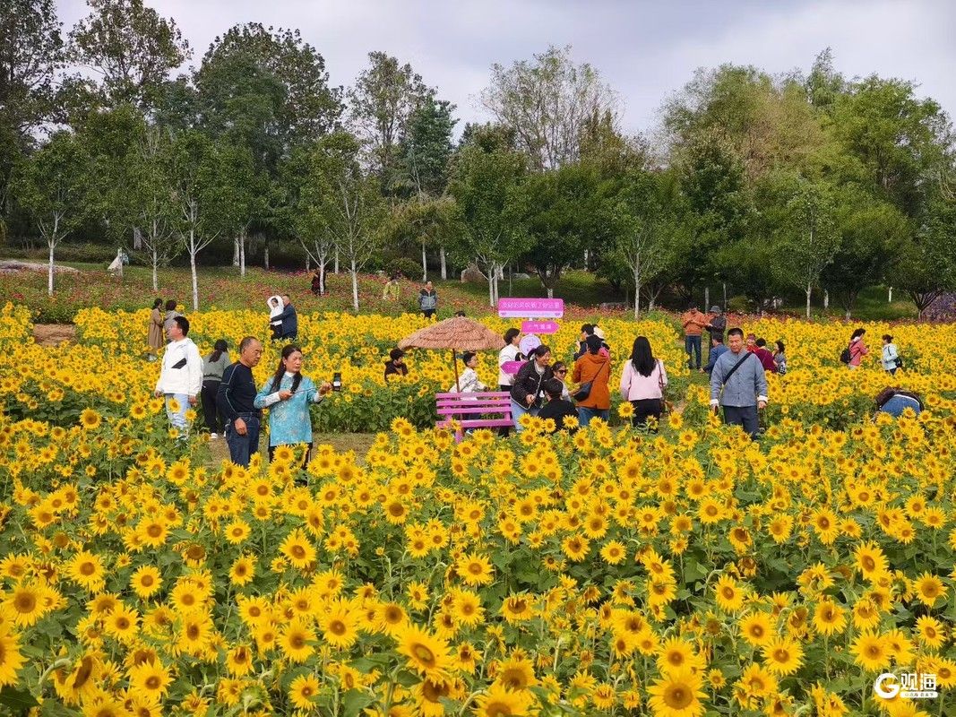 不远处的花语人间浪漫多姿,粉黛乱子草随着微风掀起粉色涟漪,向日葵花田里是成片的金黄花盘。花径上,百日草铺展成绚烂花毯,红橙黄紫次第绽放;马鞭草摇曳着淡紫花序,自带清新氛围感;格桑花在风中轻舞,粉白相间的花瓣更添野趣,与粉黛的柔美、向日葵的热烈形成错落有致的浪漫图景。(青岛日报/观海新闻记者 王凯 通讯员 王雪)
