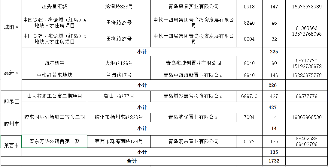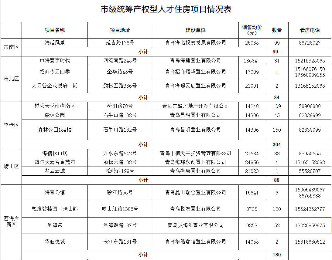 记者注意到,情况表中包括市南区1个项目、市北区3个项目、李沧区3个项目、崂山区3个项目、西海岸新区4个项目、城阳区3个项目、高新区2个项目、即墨区1个项目、胶州市1个项目、莱西市1个项目。名单中既有这些在售产权型人才住房项目的名称、具体地址,还包含建设单位、销售均价、数量以及看房电话。(青岛日报/观海新闻记者 王冰洁)