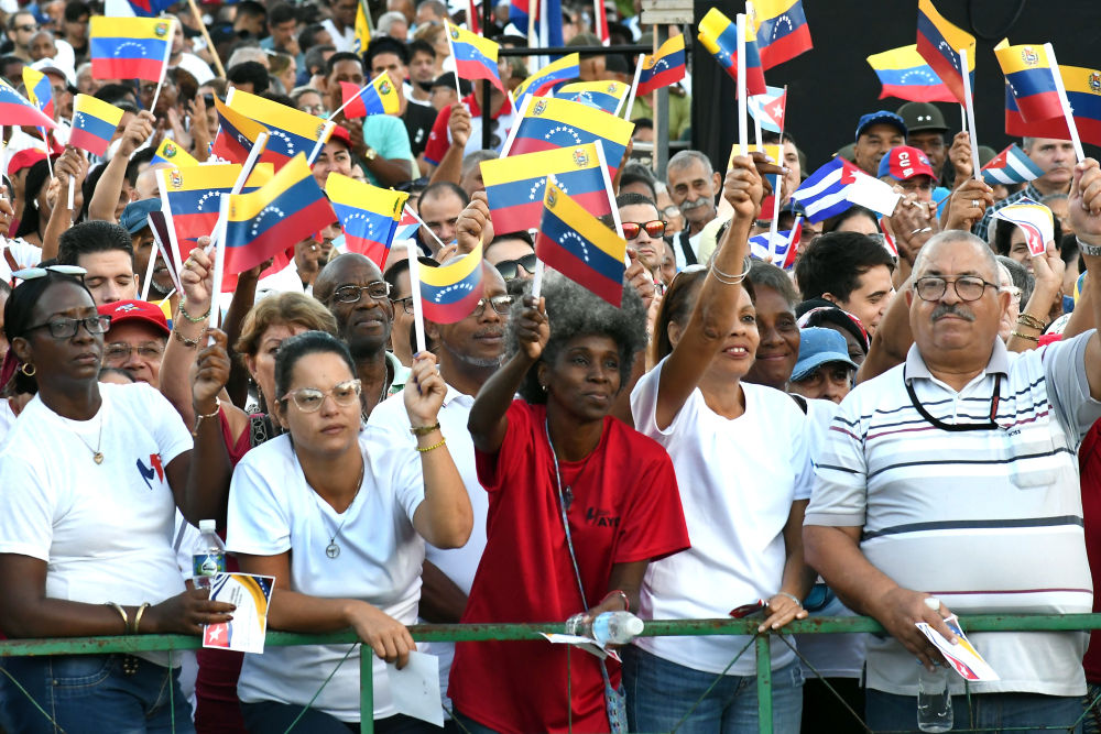 10月17日,在古巴首都哈瓦那,古巴民众挥舞旗帜参加集会,抗议美国军事威胁委内瑞拉,表达对委内瑞拉人民和政府的坚定支持。新华社发(华金·埃尔南德斯 摄)