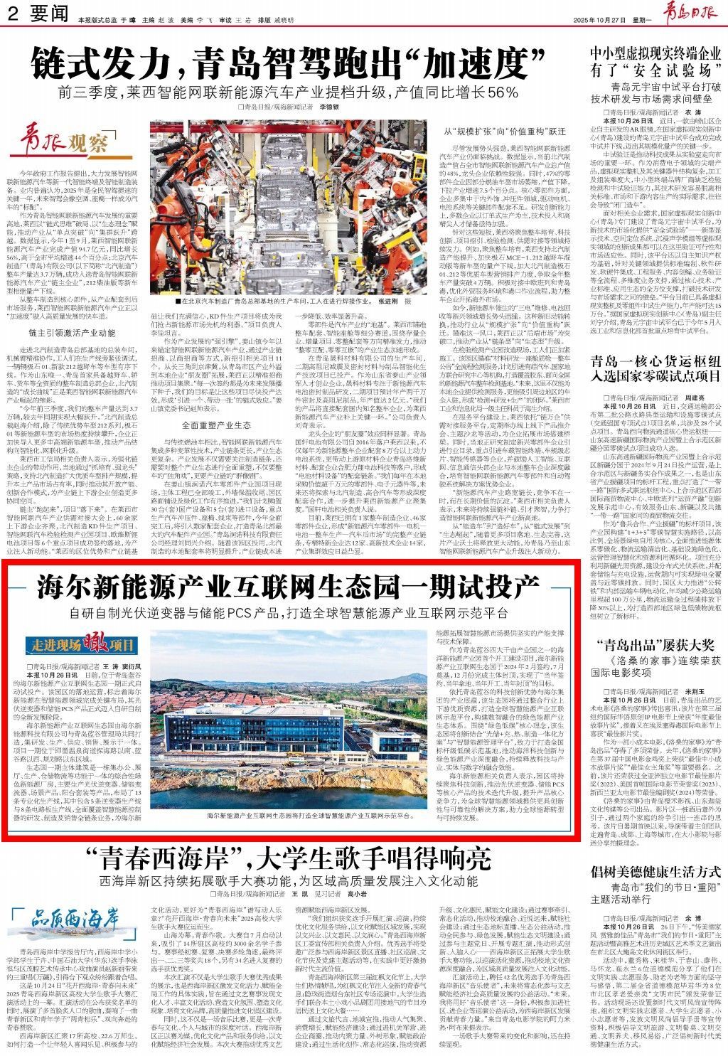 青岛日报社/观海新闻讯 日前,位于青岛蓝谷的海尔新能源产业互联网生态园一期正式启动试投产。该园区的落地运营,标志着海尔新能源在智慧能源领域完成关键布局,其光伏逆变器和储能PCS产品正式迈入自研自制的全新发展阶段。