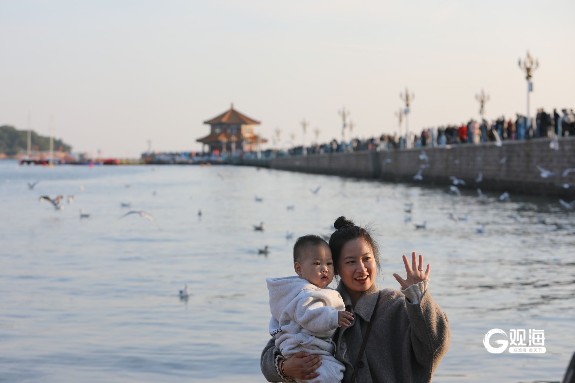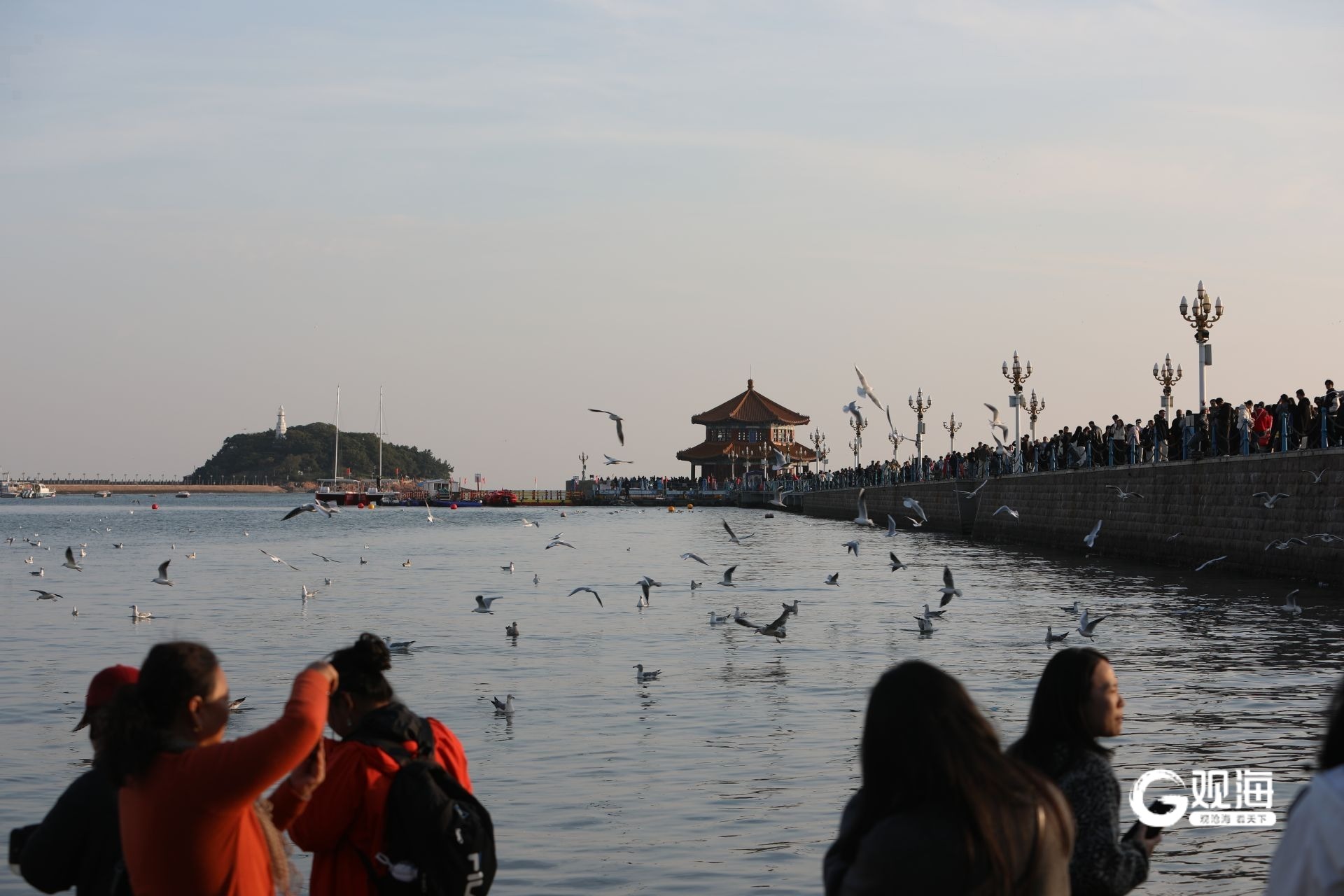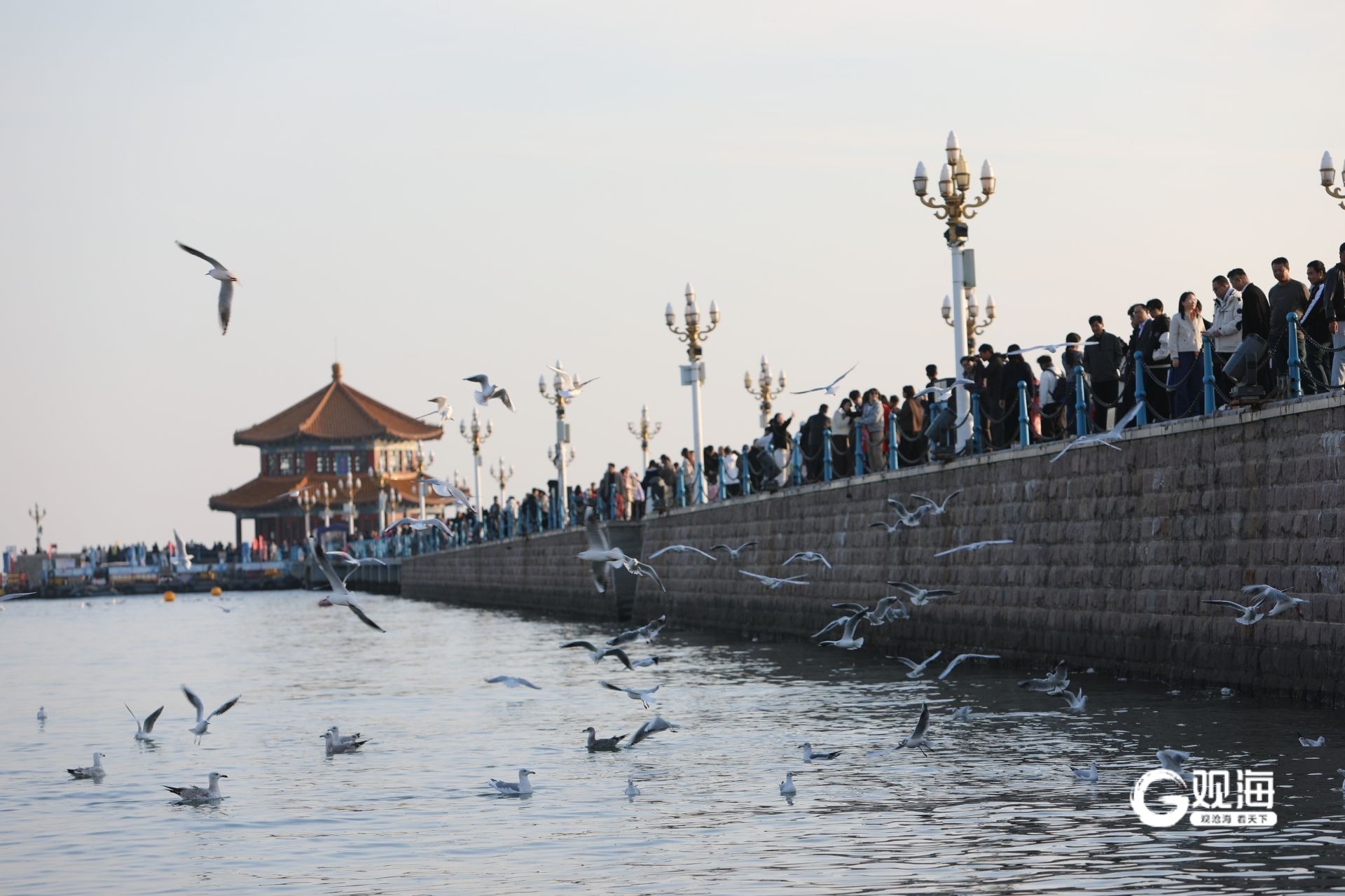 栈桥景区,海鸥与游客亲密互动。