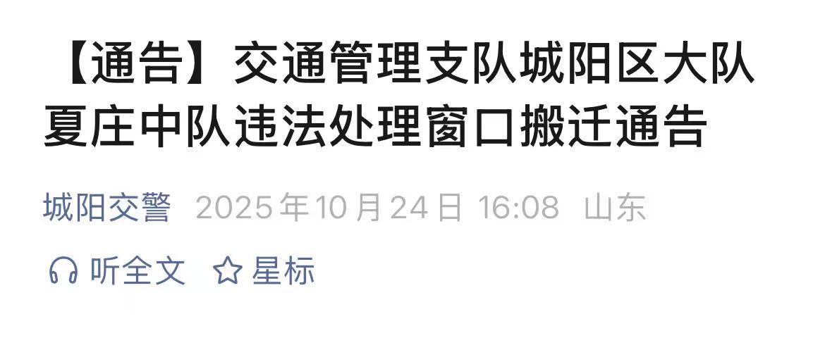 交通管理支队城阳区大队夏庄中队违法处理窗口搬迁通告