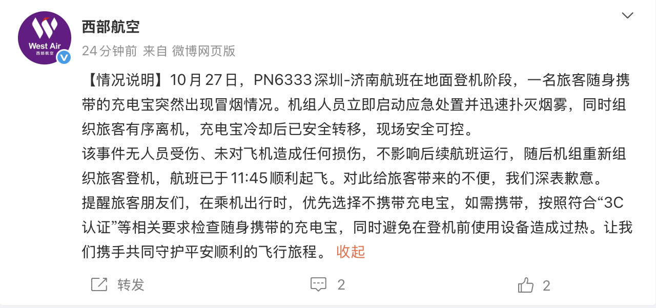 10月27日,PN6333深圳-济南航班在地面登机阶段,一名旅客随身携带的充电宝突然出现冒烟情况。机组人员立即启动应急处置并迅速扑灭烟雾,同时组织旅客有序离机,充电宝冷却后已安全转移,现场安全可控。