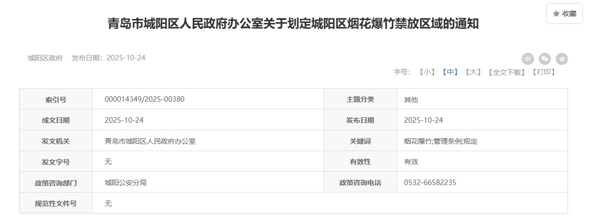 青岛日报社/观海新闻10月27日讯 青岛市城阳区人民政府办公室关于划定城阳区烟花爆竹禁放区域的通知近日发布。